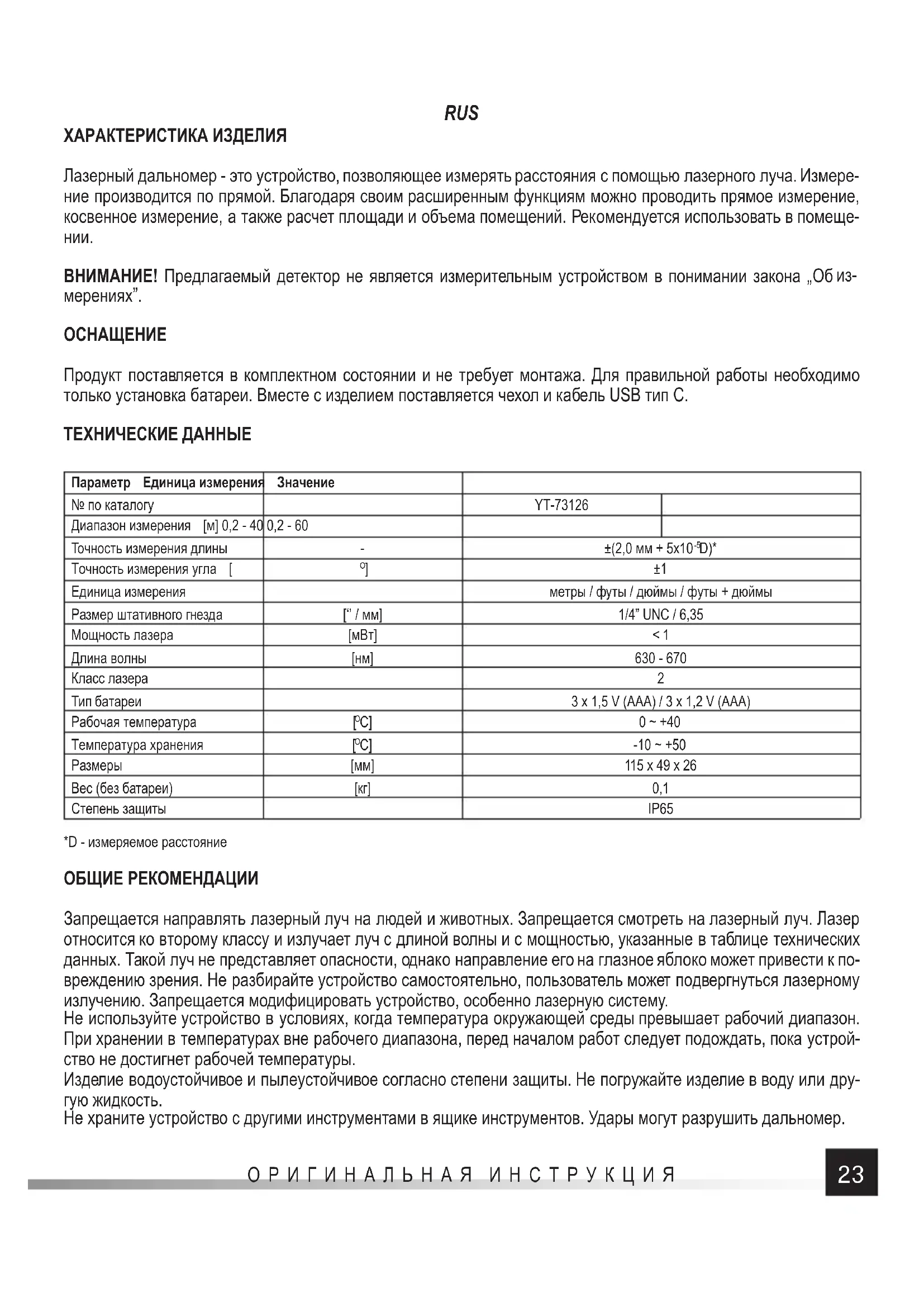 Продукт поставляется в комплектном состоянии и не требует монтажа. Для правильной работы необходимо только установка батареи. Вместе с изделием поставляется чехол и кабель USB тип C. ТЕХНИЧЕСКИЕ ДАННЫЕ Параметр Единица измерения Значение № по каталогу YT-73126 YT-73127 Диапазон измерения [м] 0,2 - 40 0,2 - 60 Точность измерения длины - ±(2,0 мм + 5x10