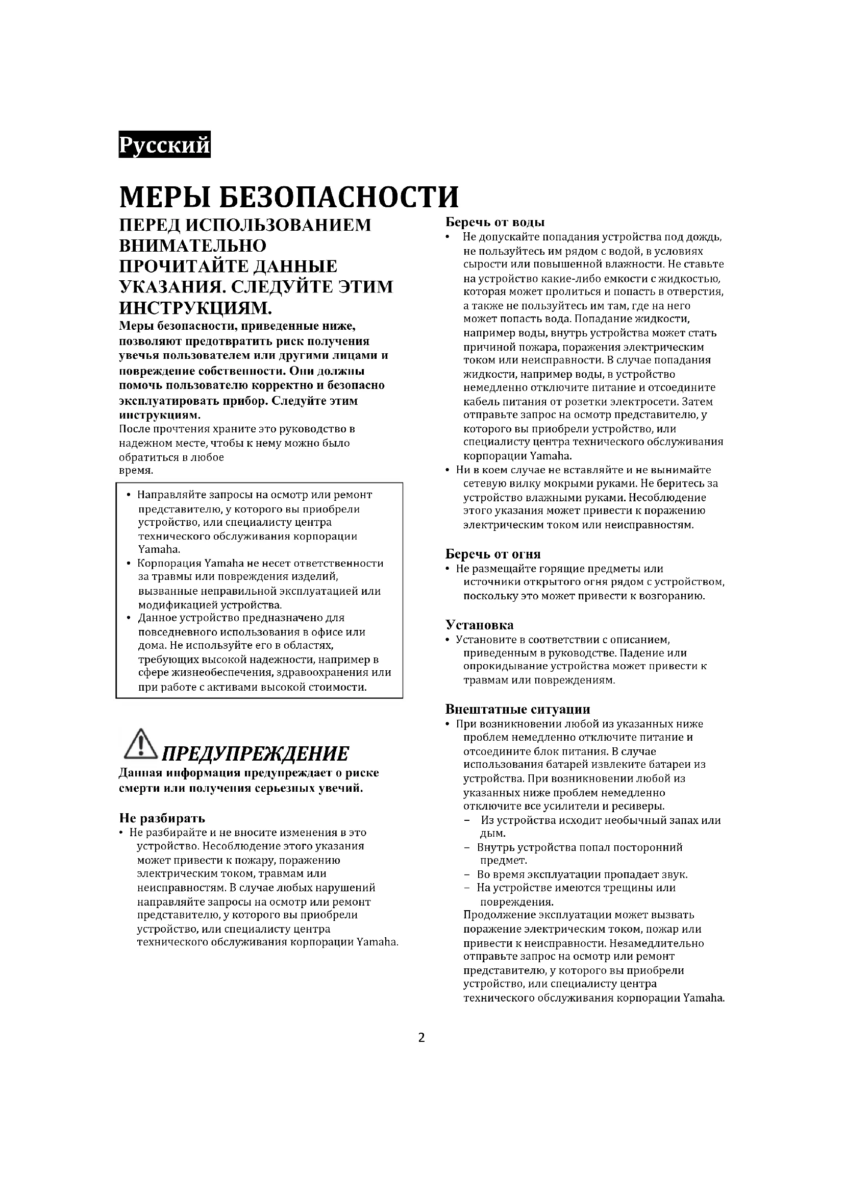 - Не разбирайте и не вносите изменения в это устройство. Несоблюдение этого указания может привести к пожару, поражению электрическим током, травмам или неисправностям. В случае любых нарушений направляйте запросы на осмотр или ремонт представителю, у которого вы приобрели устройство, или специалисту центра технического обслуживания корпорации Yamaha.