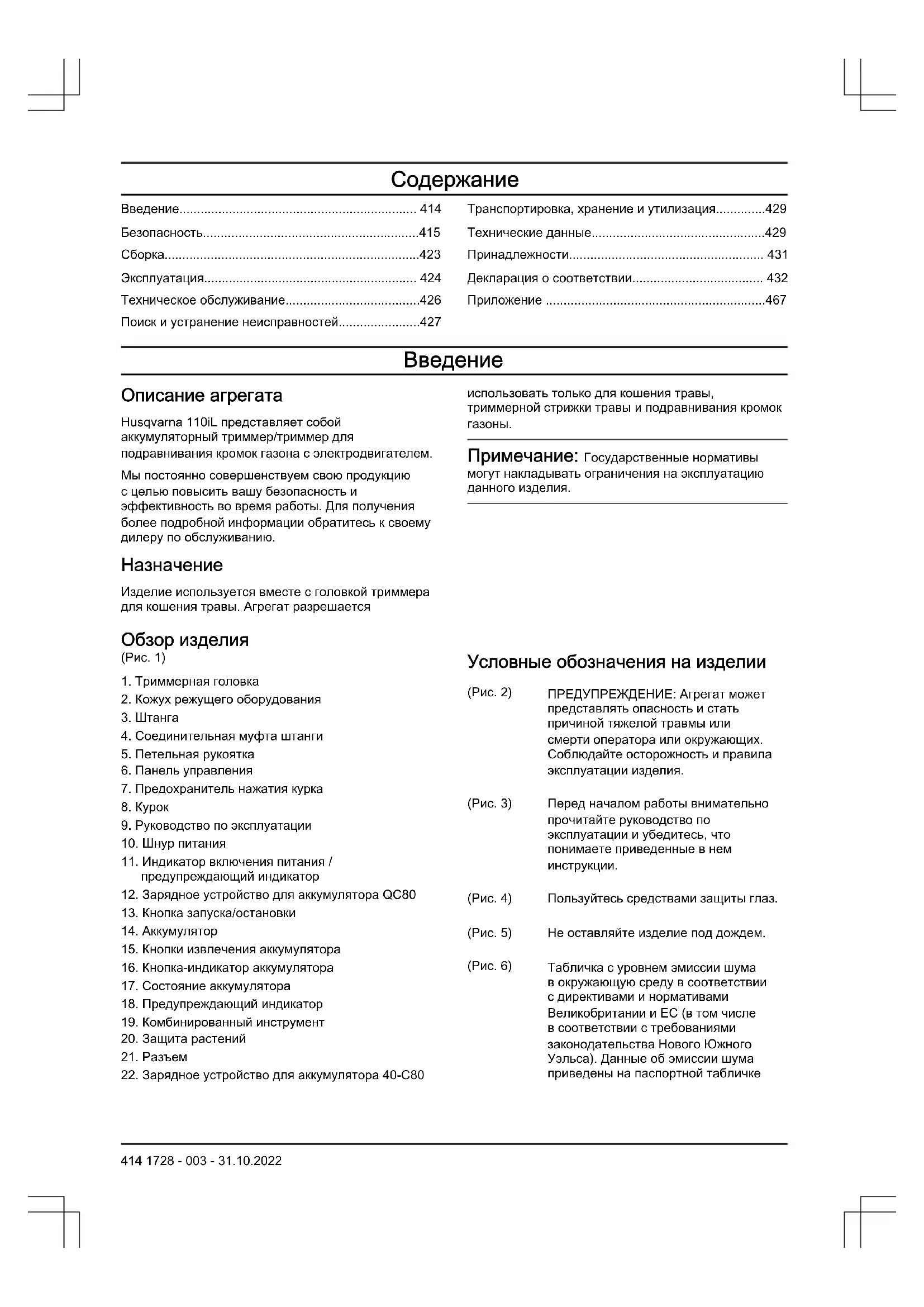 Условные обозначения на изделии (Pис. 2) ПРЕДУПРЕЖДЕНИЕ: Агрегат может представлять опасность и стать причиной тяжелой травмы или смерти оператора или окружающих. Соблюдайте осторожность и правила эксплуатации изделия. (Pис. 3) Перед началом работы внимательно прочитайте руководство по эксплуатации и убедитесь, что понимаете приведенные в нем инструкции. (Pис. 4) Пользуйтесь средствами защиты глаз. (Pис. 5) Не оставляйте изделие под дождем. (Pис. 6) Табличка с уровнем эмиссии шума в окружающую среду в соответствии с директивами и нормативами Великобритании и ЕС (в том числе в соответствии с требованиями законодательства Нового Южного Уэльса). Данные об эмиссии шума приведены на паспортной табличке 414 1728 - 003 - 31.10.2022агрегата и в разделе "Технические
