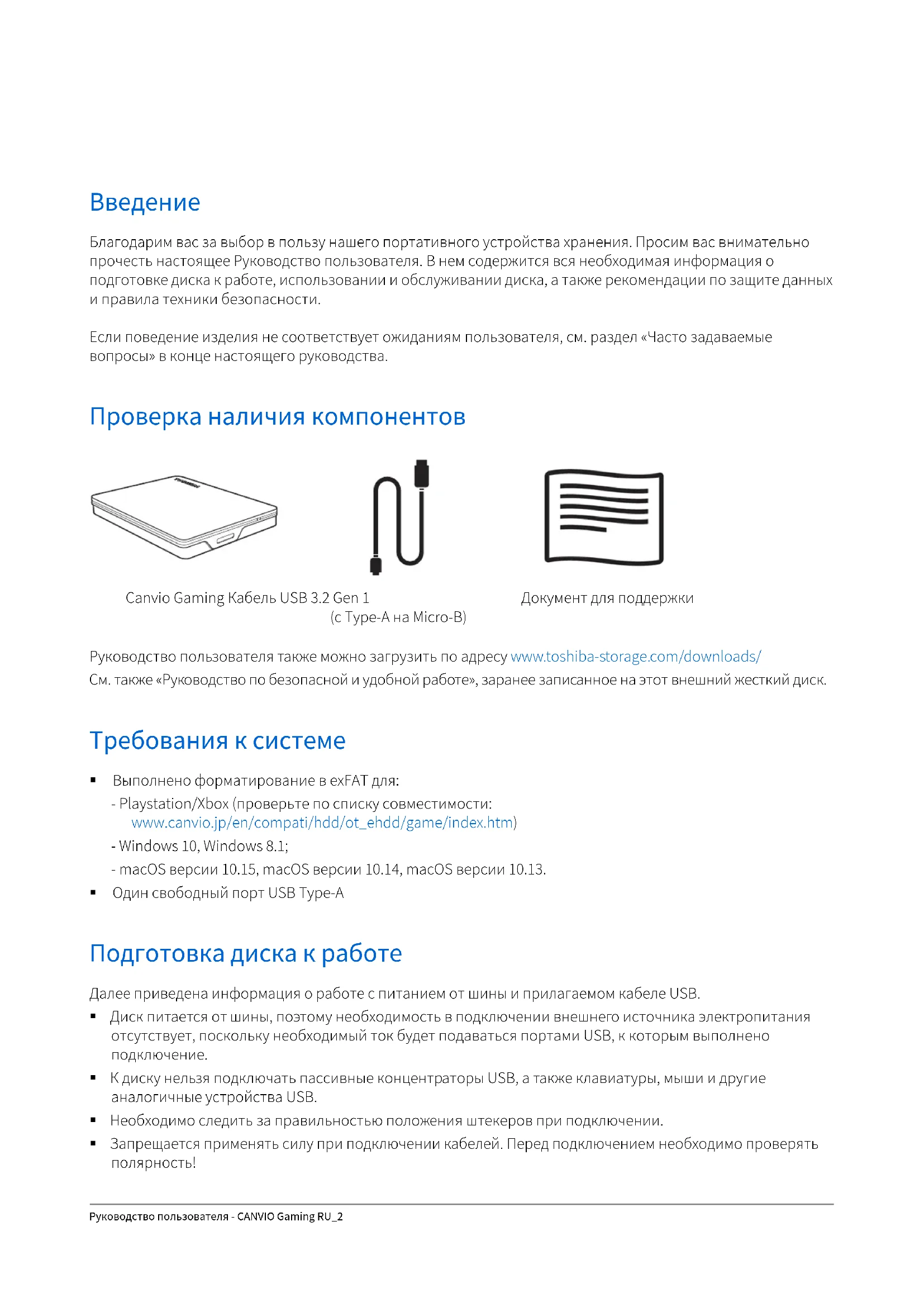 Благодарим вас за выбор в пользу нашего портативного устройства хранения. Просим вас внимательно прочесть настоящее Руководство пользователя. В нем содержится вся необходимая информация о подготовке диска к работе, использовании и обслуживании диска, а также рекомендации по защите данных и правила техники безопасности. Если поведение изделия не соответствует ожиданиям пользователя, см. раздел «Часто задаваемые вопросы» в конце настоящего руководства. Проверка наличия компонентов Руководство пользователя также можно загрузить по адресу www.toshiba-storage.com/downloads/ См. также «Руководство по безопасной и удобной работе», заранее записанное на этот внешний жесткий диск. Требования к системе Выполнено форматирование в exFAT для: - Playstation/Xbox (проверьте по списку совместимости: www.canvio.jp/en/compati/hdd/ot_ehdd/game/index.htm) - Windows 10, Windows 8.1; - macOS версии 10.15, macOS версии 10.14, macOS версии 10.13. Один свободный порт USB Type-A Подготовка диска к работе Далее приведена информация о работе с питанием от шины и прилагаемом кабеле USB. Диск питается от шины, поэтому необходимость в подключении внешнего источника электропитания отсутствует, поскольку необходимый ток будет подаваться портами USB, к которым выполнено подключение. К диску нельзя подключать пассивные концентраторы USB, а также клавиатуры, мыши и другие аналогичные устройства USB. Необходимо следить за правильностью положения штекеров при подключении. Запрещается применять силу при подключении кабелей. Перед подключением необходимо проверять полярность! Canvio Gaming Кабель USB 3.2 Gen 1 (с Type-A на Micro-B) Документ для поддержкиРуководство пользователя - CANVIO Gaming RU_3 Подключение диска к совместимому устройству Узнайте о совместимости такого устройства и ознакомьтесь с инструкциями по его подключению, изучив соответствующие руководства пользователя устройства.