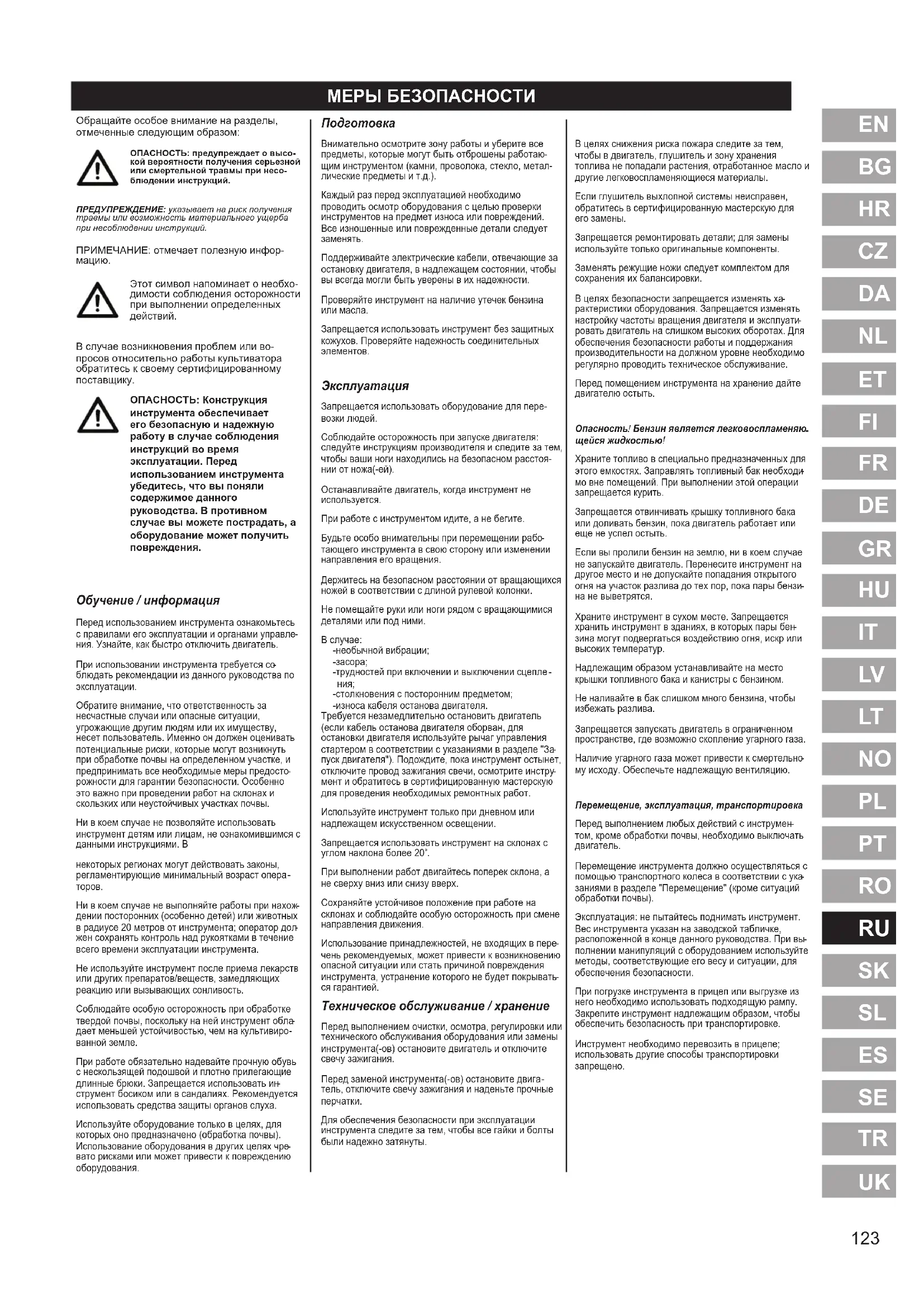 рожности для гарантии безопасности. Особенно это важно при проведении работ на склонах и скользких или неустойчивых участках почвы. Ни в коем случае не позволяйте использовать инструмент детям или лицам, не ознакомившимся с данными инструкциями. В некоторых регионах могут действовать законы, регламентирующие минимальный возраст опера
