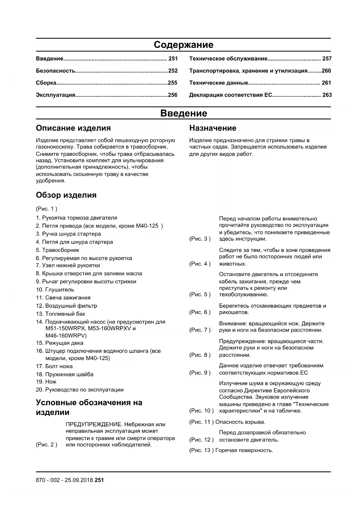 Описание изделия Изделие представляет собой пешеходную роторную газонокосилку. Трава собирается в травосборник. Снимите травосборник, чтобы трава отбрасывалась назад. Установите комплект для мульчирования (дополнительная принадлежность), чтобы использовать скошенную траву в качестве