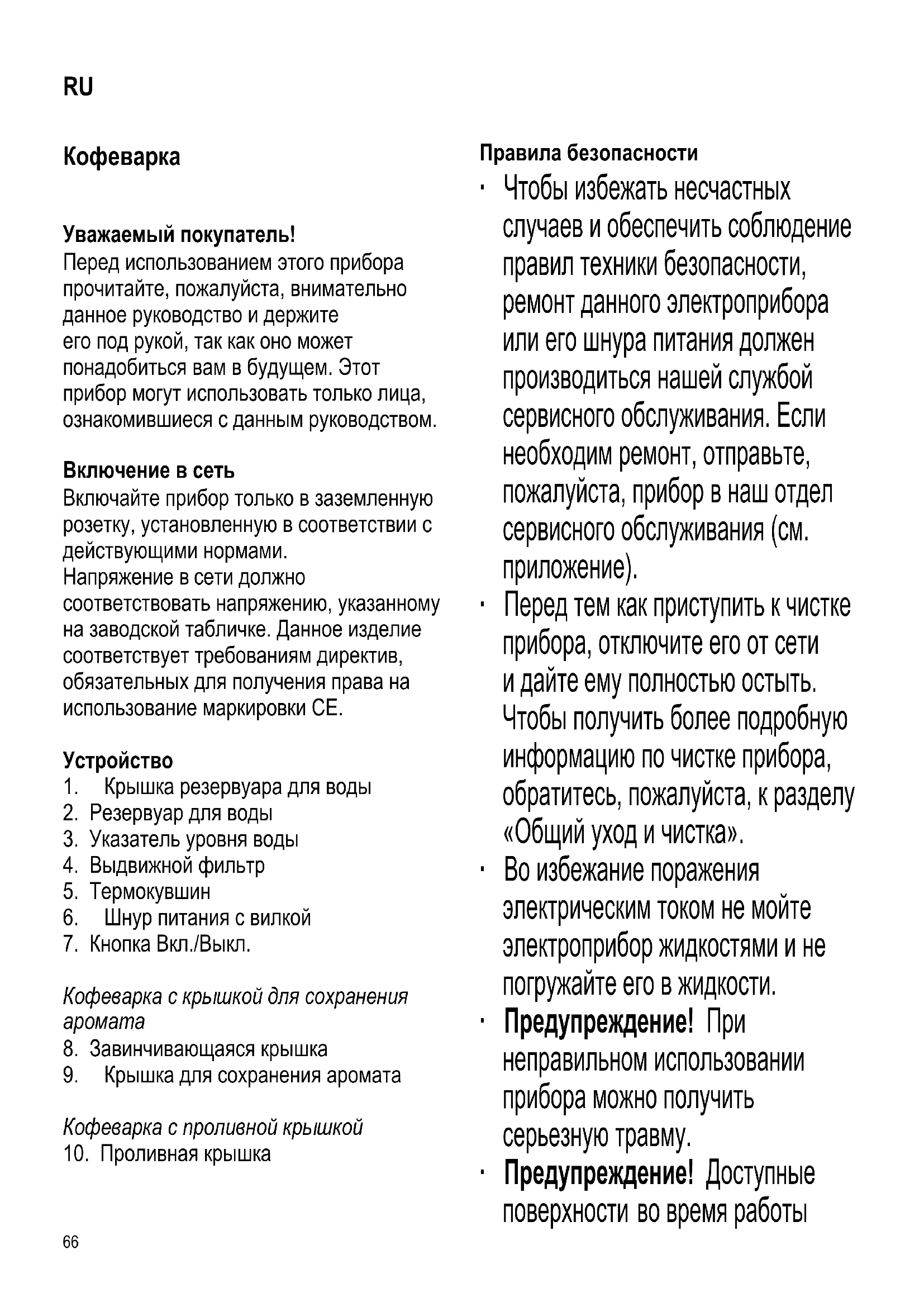 ему полностью остыть. Чтобы получить более подробную информацию по чистке прибора, обратитесь, пожалуйста, к разделу «Общий уход и чистка». ∙ Во избежание поражения электрическим током не мойте электроприбор жидкостями и не погружайте его в жидкости. ∙ Предупреждение! При неправильном использовании прибора можно получить серьезную травму. ∙ Предупреждение! Доступные поверхности во время работы RU67 кофеварки нагреваются и потом остаются горячими еще в течение некоторого времени. ∙ Этот электроприбор предназначен для использования в домашних или подобных условиях, как,