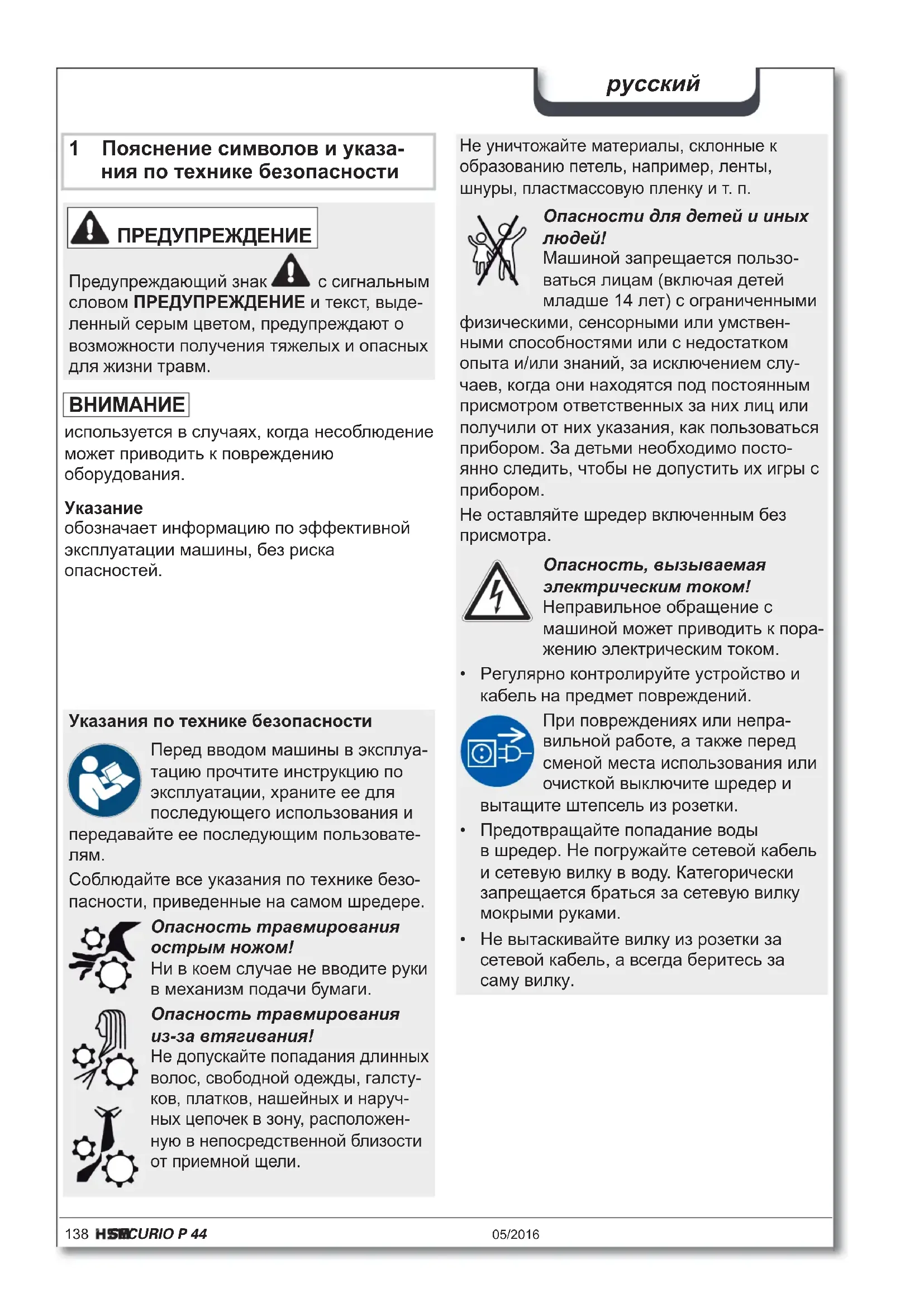Соблюдайте все указания по технике безо- пасности, приведенные на самом шредере. Опасность травмирования острым ножом! Ни в коем случае не вводите руки в механизм подачи бумаги. Опасность травмирования из-за втягивания! Не допускайте попадания длинных волос, свободной одежды, галсту- ков, платков, нашейных и наруч- ных цепочек в зону, расположен- ную в непосредственной близости от приемной щели. Не уничтожайте материалы, склонные к образованию петель, например, ленты, шнуры, пластмассовую пленку и т. п. Опасности для детей и иных