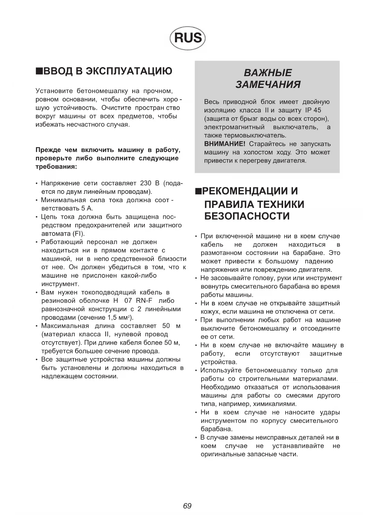 RUS ■ ВВОД В ЭКСПЛУАТАЦИЮ Установите бетономешалку на прочном, ровном основании, чтобы обеспечить хоро - шую устойчивость. Очистите простран ство вокруг машины от всех предметов, чтобы избежать несчастного случая. Прежде чем включить машину в работу, проверьте либо выполните следующие требования: