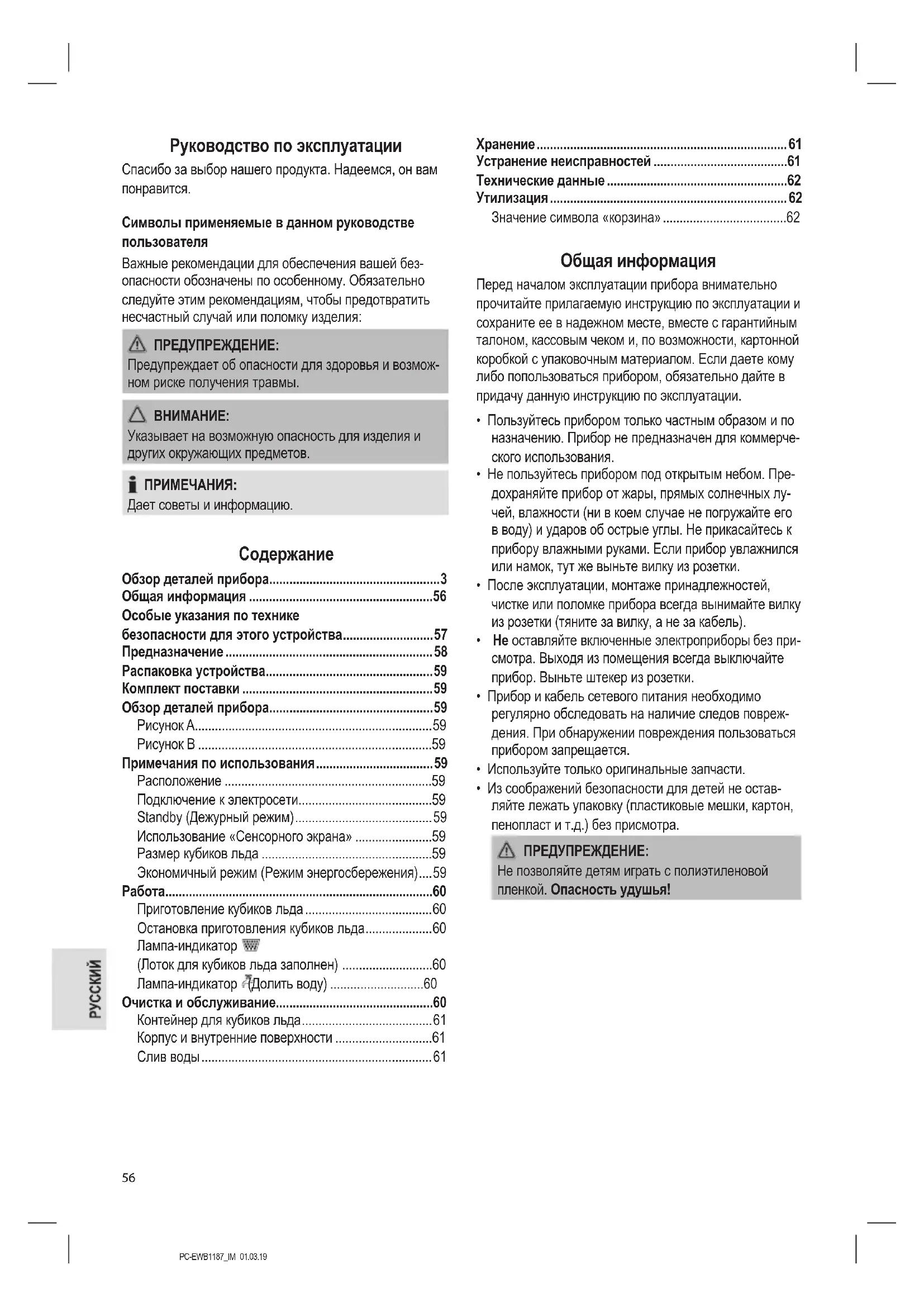 Использование «Сенсорного экрана» Устройство управляется с помощью сенсорного экрана. Слегка нажимайте пальцами на высвечиваемые на дисплее кнопки ON / OFF и MODE чтобы выполнить соответствующие функции. Размер кубиков льда Можно выбрать один из 3 размеров: - небольшие (S) - средние (M) - крупные (L) Экономичный режим (Режим энергосбережения) После наполнения контейнера кубиков льда, прибор переключается в дежурный режим. Вы извлечете пользу из усиленной безопасности и пониженного энергопотребления.PC-EWB1187_IM 01.03.19