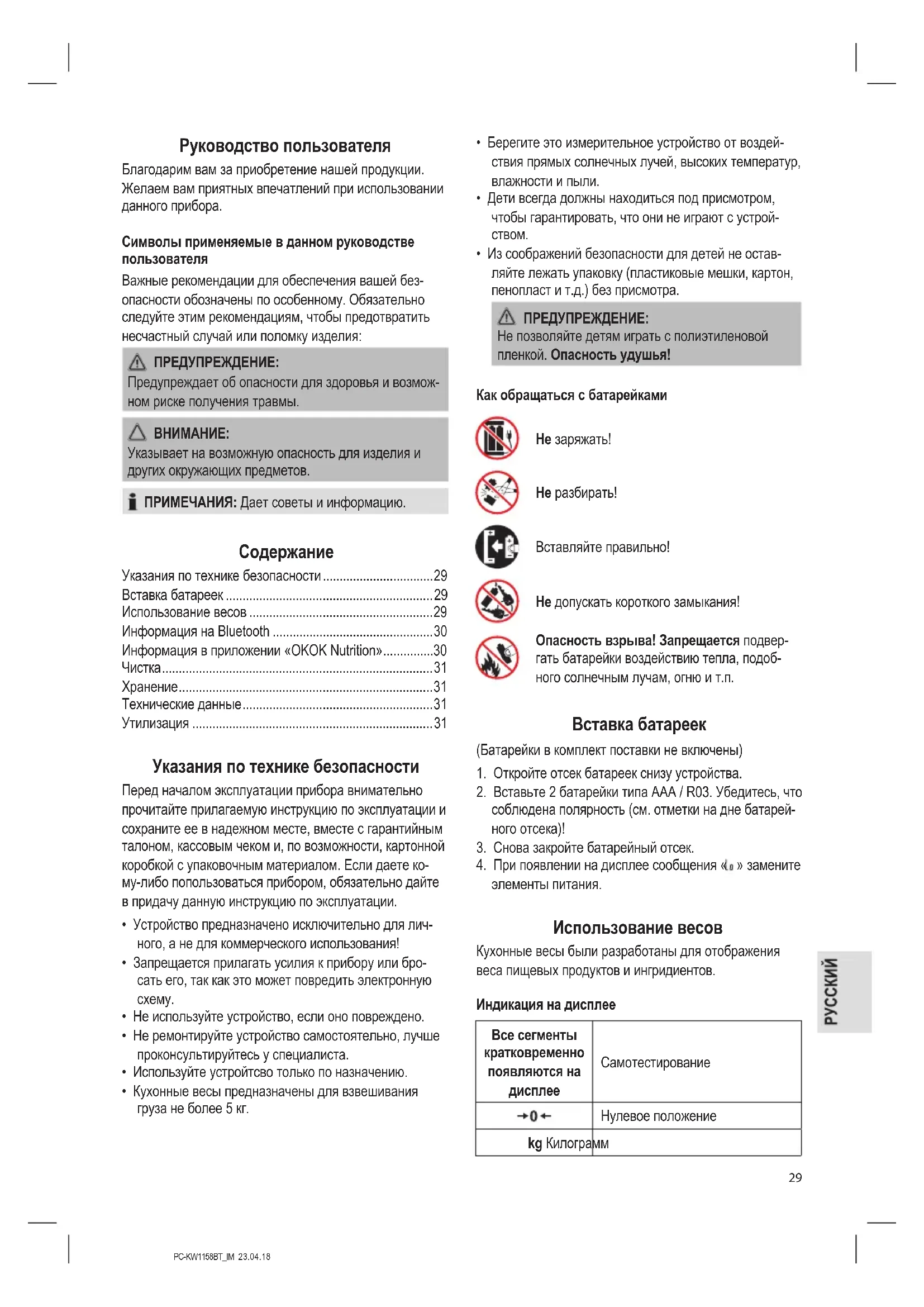 - Приавтоматическом выключении весы выключатся автоматически через примерно 60 секунд. Если вы хотите выключить весы раньше, нажмите и удерживайте кнопку / TARE примерно в течение 2 секунд. Периоды, когда прибор не используется При длительном неиспользовании прибора вытащите батарейки для предотвращения «вытекания» аккумуля- торной кислоты. Информация на Bluetooth Bluetooth – это технология удаленного беспроводного соединения приборов на коротких расстояниях. При- боры со стандартным Bluetooth передают в промыш- ленном, научном и медицинском диапазоне (Industrial, Scientic and Medical) от 2,402 до 2,480 ГГц. Могут воз- никать помехи, например, от сетей WLAN, радио DAB, беспроводных телефонов и микроволновых печей, которые работают в том же частотном диапазоне. Данные весы позволяют вам отправлять расчетные данные по Bluetooth на ваш смартфон или планшетный ПК. Более подробную информацию можно найти в сле- дующем разделе (Информация в приложении «OKOK Nutrition»). Полная функциональность не может быть гаранти- рована из-за большого количества производителей приборов, самих моделей и версий программного обеспечения. Информация в приложении «OKOK Nutrition» Прибор можно подключить к приложению OKOK Nutrition. Данное приложение анализирует состав про- дуктов. Анализируемые характеристики: калорийность, жиры, белки, углеводы, клетчатка, холестерин, кальций