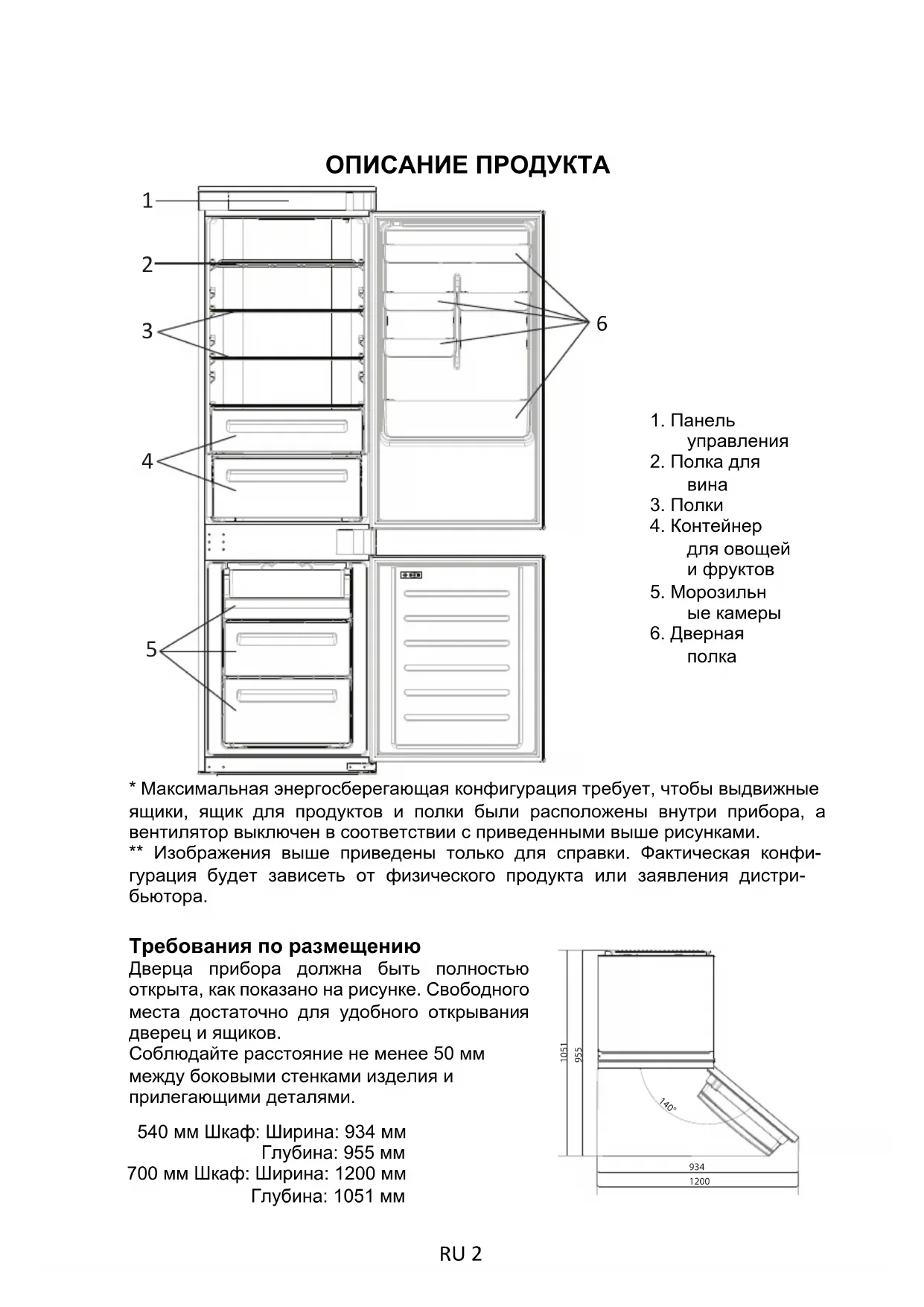 3. Полки4. Контейнердля овощейи фруктов5. Морозильные камеры6. Двернаяполка* Максимальная энергосберегающая конфигурация требует, чтобы выдвижныеящики, ящик для продуктов и полки были расположены внутри прибора, авентилятор выключен в соответствии с приведенными выше рисунками.** Изображения выше приведены только для справки. Фактическая конфи- гурация будет зависеть от физического продукта или заявления дистри- бьютора.Требования по размещению Дверца прибора должна быть полностью открыта, как показано на рисунке. Свободного места достаточно для удобного открывания дверец и ящиков. Соблюдайте расстояние не менее 50 мм между боковыми стенками изделия и прилегающими деталями.540 мм Шкаф: Ширина: 934 ммГлубина: 955 мм700 мм Шкаф: Ширина: 1200 ммГлубина: 1051 мм