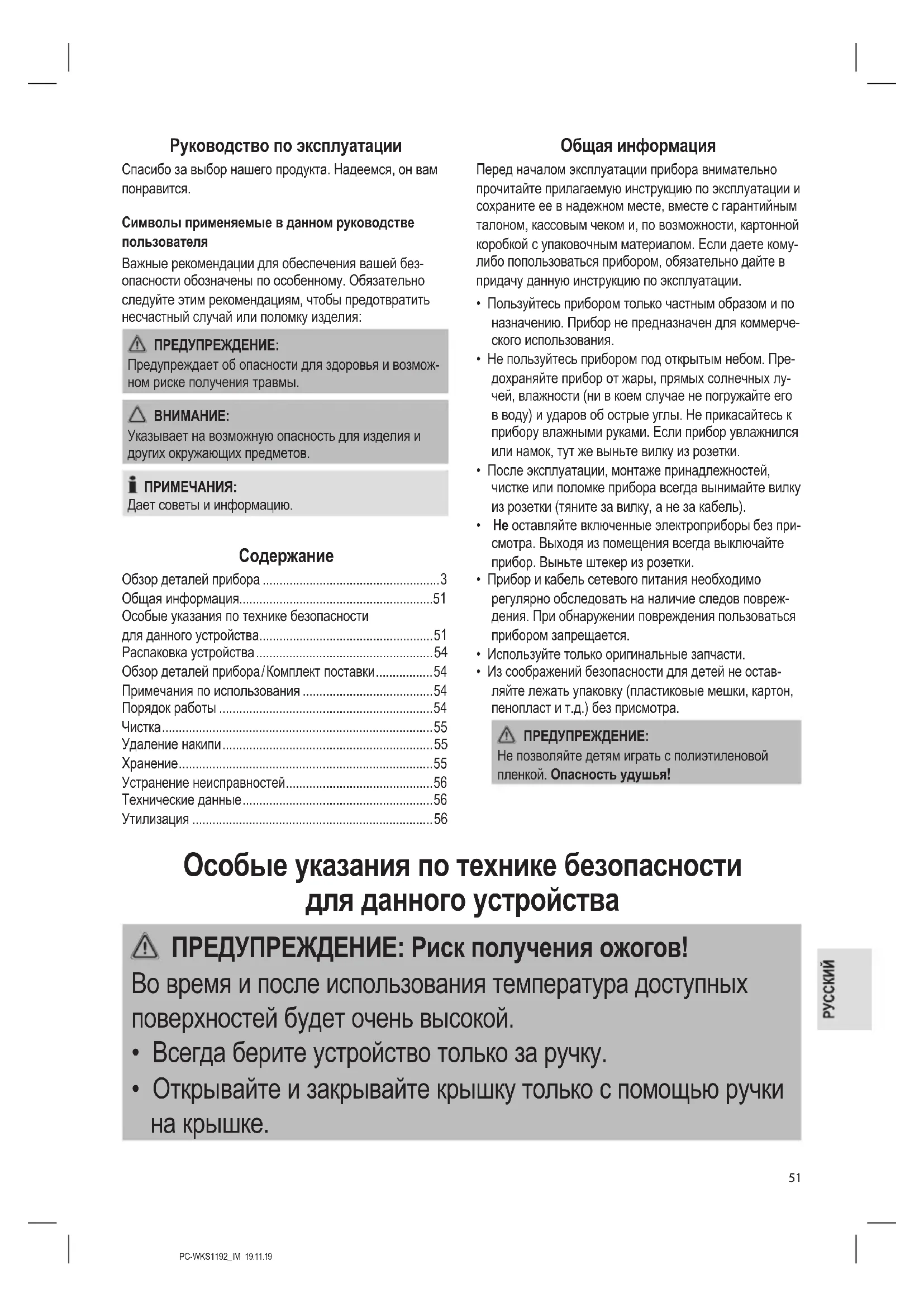 - При открывании прибора может выходить горячий пар!PC-WKS1192_IM 19.11.19
