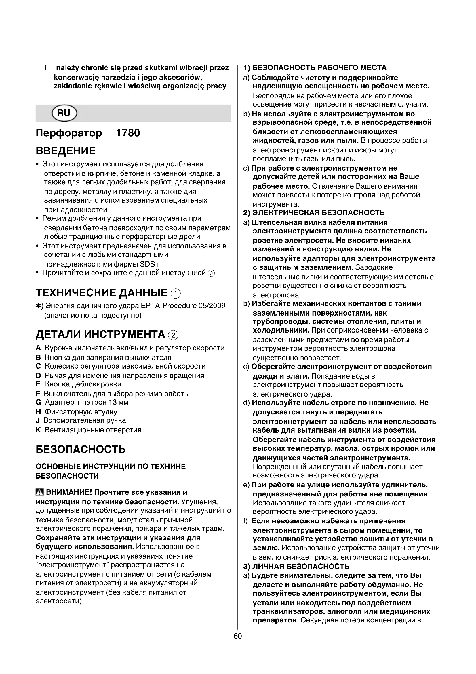 - Прочитайте и сохраните с данной инструкцией 3 ТЕХНИЧЕСКИЕДАННЫЕ1 ✱) Энергия единичного удара EPTA-Procedure 05/2009 (значение пока недоступно) ДЕТАЛИИНСТРУМЕНТА2 A Курок-выключатель вкл/выкл и регулятор скорости B Кнопка для запиpания выключателя C Колесико регулятора максимальной скорости D Рычая для изменения напpавления вpащения E Кнопка деблокировки F Выключатель для выбора режима работы G Адаптер + патрон 13 мм H Фиксаторную втулку J Вспомогательная ручка K Вентиляционные отверстия БЕЗОПАСНОСТЬ ОСНОВНЫЕИНСТРУКЦИИПОТЕХНИКЕ БЕЗОПАСНОСТИ ВНИМАНИЕ!Прочтитевсеуказанияи инструкциипотехникебезопасности. Упущения, допущенные при соблюдении указаний и инструкций по технике безопасности, могут сталь причиной электрического поражения, пожара и тяжелых травм. Сохраняйтеэтиинструкциииуказаниядля будущегоиспользования. Использованное в настоящих инструкциях и указаниях понятие “электроинструмент” распространяется на электроинструмент с питанием от сети (с кабелем питания от электросети) и на аккумуляторный электроинструмент (без кабеля питания от электросети). 1)БЕЗОПАСНОСТЬРАБОЧЕГОМЕСТА a) Соблюдайтечистотуиподдерживайте надлежащуюосвещенностьнарабочемместе. Беспорядок на рабочем месте или его плохое освещение могут привести к несчастным случаям. b) Неиспользуйтесэлектроинструментомво взрывоопаснойсреде,т.е.внепосредственной близостиотлегковоспламеняющихся жидкостей,газовилипыли.В процессе работы электроинструмент искрит и искры могут воспламенить газы или пыль. c) Приработесэлектроинструментомне допускайтедетейилипостороннихнаВаше рабочееместо.Отвлечение Вашего внимания может привести к потере контроля над работой инструмента. 2)ЭЛЕКТРИЧЕСКАЯБЕЗОПАСНОСТЬ a) Штепсельнаявилкакабеляпитания электроинструментадолжнасоответствовать розеткеэлектросети.Невноситеникаких измененийвконструкциювилки.Не используйтеадапторыдляэлектроинструмента сзащитнымзаземлением.Заводские штепсельные вилки и соответствующие им сетевые розетки существенно снижают вероятность электрошока. b) Избегайтемеханическихконтактовстакими заземленнымиповерхностями,как трубопроводы,системыотопления,плитыи холодильники.При соприкосновении человека с заземленными предметами во время работы инструментом вероятность электрошока существенно возрастает. c) Оберегайтеэлектроинструментотвоздействия дождяивлаги.Попадание воды в электроинструмент повышает вероятность электрического удара. d) Используйтекабельстрогопоназначению.Не допускаетсятянутьипередвигать электроинструментзакабельилииспользовать кабельдлявытягиваниявилкиизрозетки. Оберегайтекабельинструментаотвоздействия высокихтемператур,масла,острыхкромокили движущихсячастейэлектроинструмента. Поврежденный или спутанный кабель повышает возможность электрического удара. e) Приработенаулицеиспользуйтеудлинитель, предназначенныйдляработывнепомещения. Использование такого удлинителя снижает вероятность электрического удара. f) Еслиневозможноизбежатьприменения электроинструментавсыромпомещении,то устанавливайтеустройствозащитыотутечкив землю. Использование устройства защиты от утечки в землю снижает риск электрического поражения. 3)ЛИЧНАЯБЕЗОПАСНОСТЬ a) Будьтевнимательны,следитезатем,чтоВы делаетеивыполняйтеработуобдуманно.Не пользуйт