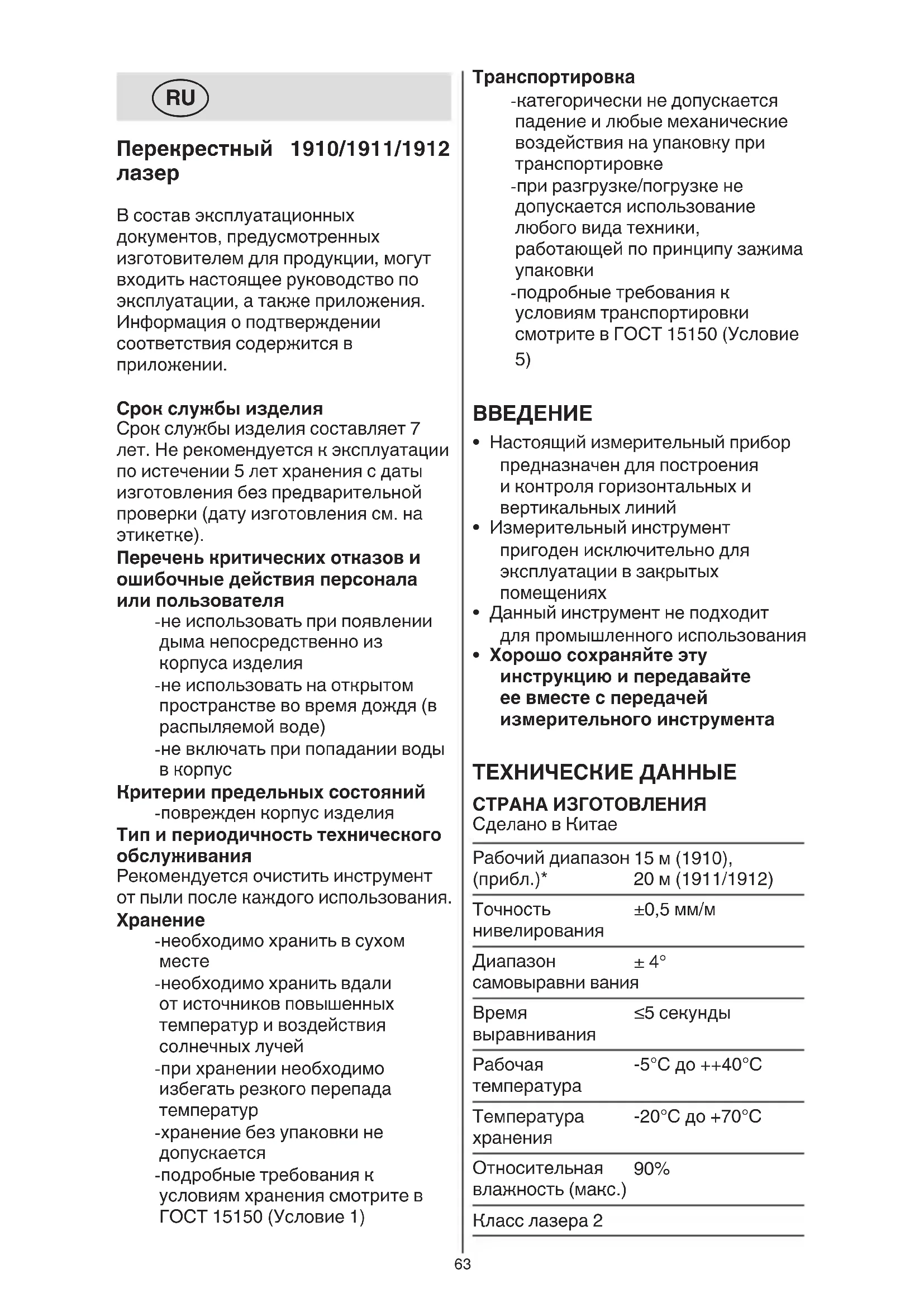 Лазерная радиация / Не смотpите на луч / Лазерное изделие класса 2 Тип лазера 635 нм (1910), 520 нм (1911/1912) Гнездо под штатив 1/4” Аккумуляторная