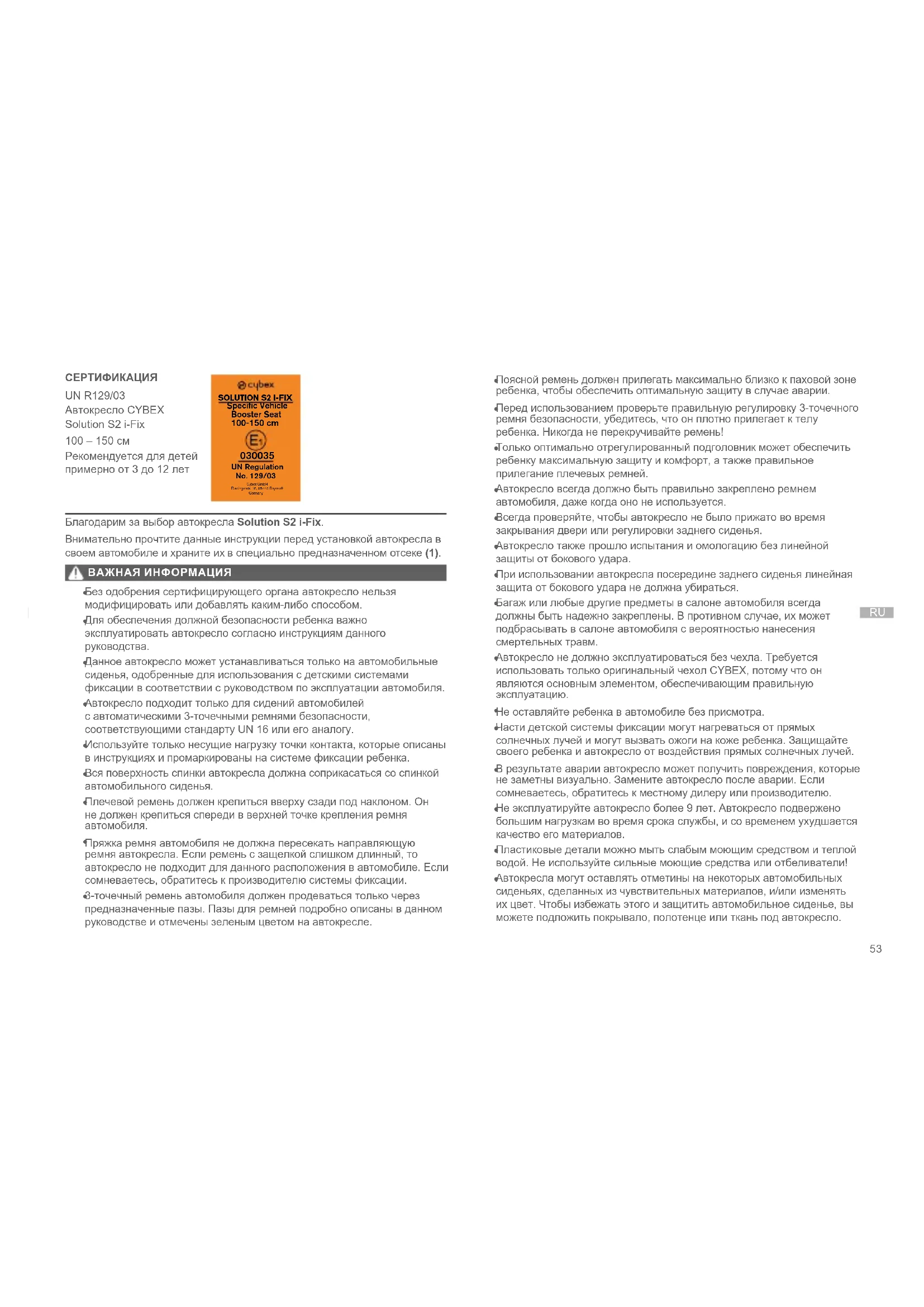 UN RegulationNo. 129/03Cybex GmbHRiedingerstr. 18, 95448 BayreuthGermany СЕРТИФИКАЦИЯ UN R129/03 Автокресло CYBEX Solution S2 i-Fix 100 – 150 см Рекомендуется для детей примерно от 3 до 12 лет