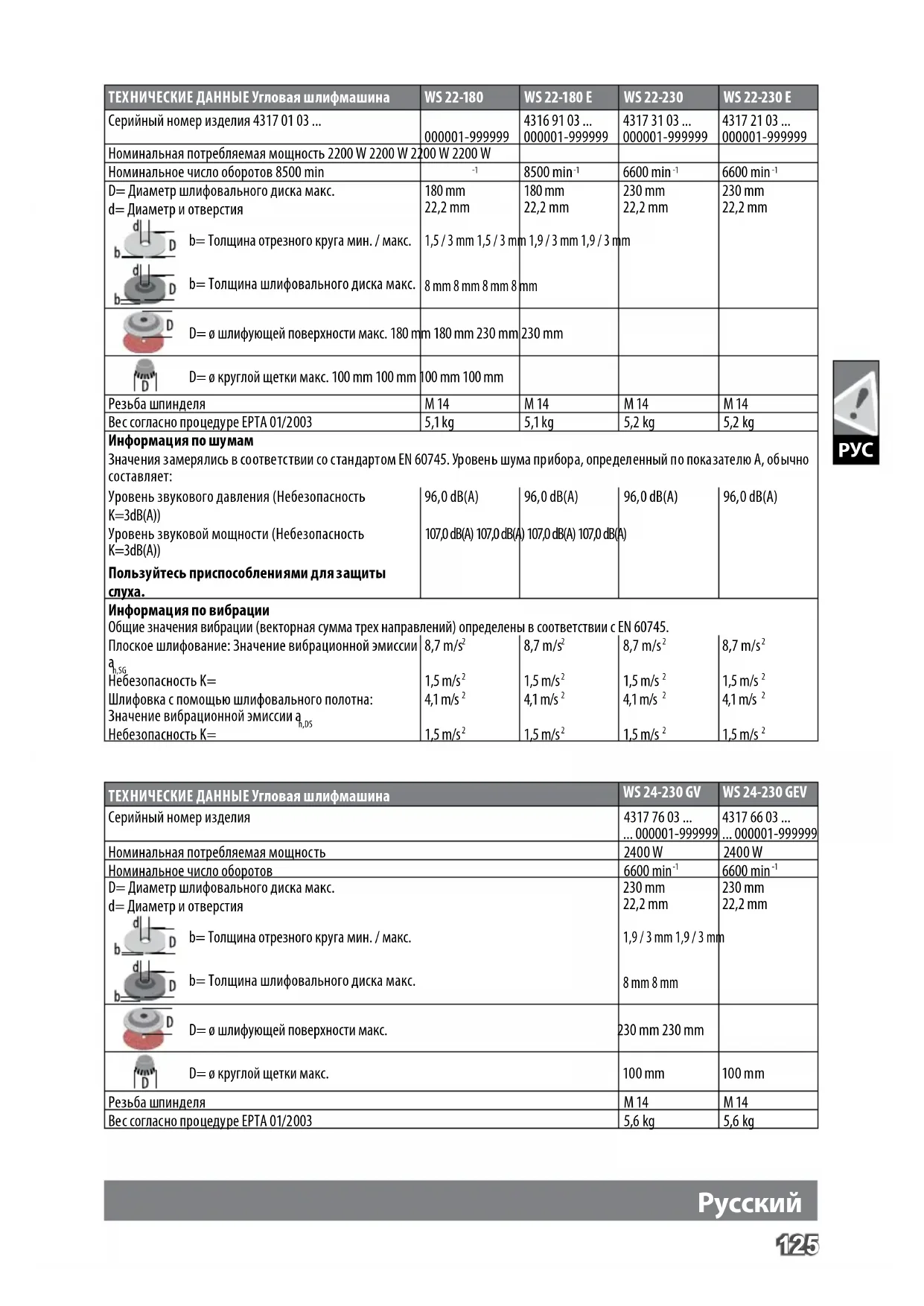 D= Диаметр шлифовального диска макс. d= Диаметр и отверстия 180 mm 22,2 mm 180 mm 22,2 mm 230 mm 22,2 mm 230 mm 22,2 mm b= Толщина отрезного круга мин. / макс. 1,5 / 3 mm 1,5 / 3 mm 1,9 / 3 mm 1,9 / 3 mm b= Толщина шлифовального диска макс. 8 mm 8 mm 8 mm 8 mm D= ø шлифующей поверхности макс. 180 mm 180 mm 230 mm 230 mm D= ø круглой щетки макс. 100 mm 100 mm 100 mm 100 mm Резьба шпинделя M 14 M 14 M 14 M 14 Вес согласно процедуре EPTA 01/2003 5,1 kg 5,1 kg 5,2 kg 5,2 kg Информация по шумам Значения замерялись в соответствии со стандартом EN 60745. Уровень шума прибора, определенный по показателю А, обычно составляет: Уровень звукового давления (Небезопасность K=3dB(A)) 96,0 dB(A) 96,0 dB(A) 96,0 dB(A) 96,0 dB(A) Уровень звуковой мощности (Небезопасность K=3dB(A)) Пользуйтесь приспособлениями для защиты