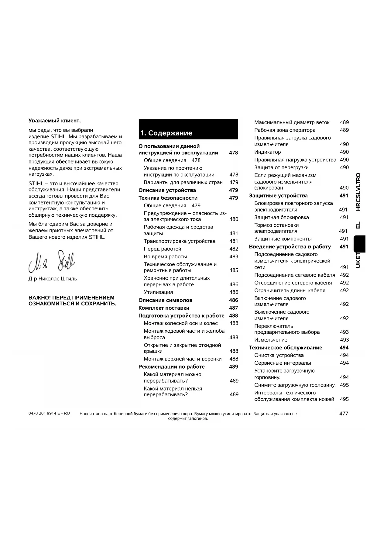 О пользовании данной инструкцией по эксплуатации 478 Общие сведения 478 Указание по прочтению инструкции по эксплуатации 478 Варианты для различных стран 479 Описание устройства 479 Техника безопасности 479 Общие сведения 479 Предупреждение – опасность из- за электрического тока 480 Рабочая одежда и средства защиты 481 Транспортировка устройства 481 Перед работой 482 Во время работы 483 Техническое обслуживание и ремонтные работы 485 Хранение при длительных перерывах в работе 486 Утилизация 486 Описание символов 486 Комплект поставки 487 Подготовка устройства к работе 488 Монтаж колесной оси и колес 488 Монтаж ходовой части и желоба выброса 488 Открытие и закрытие откидной крышки 488 Монтаж верхней части воронки 488 Рекомендации по работе 489 Какой материал можно перерабатывать?489 Какой материал нельзя перерабатывать?489 Максимальный диаметр веток 489 Рабочая зона оператора 489 Правильная загрузка садового измельчителя 490 Индикатор 490 Правильная нагрузка устройства 490 Защита от перегрузки 490 Если режущий механизм садового измельчителя блокирован 490 Защитные устройства 491 Блокировка повторного запуска электродвигателя 491 Защитная блокировка 491 Тормоз остановки электродвигателя 491 Защитные компоненты 491 Введение устройства в работу 491 Подсоединение садового измельчителя к электрической сети 491 Подсоединение сетевого кабеля 492 Отсоединение сетевого кабеля 492 Ограничитель длины кабеля 492 Включение садового измельчителя 492 Выключение садового измельчителя 492 Переключатель предварительного выбора 493 Измельчение 493 Техническое обслуживание 494 Очистка устройства 494 Сервисные интервалы 494 Установите загрузочную горловину.494 Снимите загрузочную горловину.495 Интервалы технического обслуживания комплекта ножей 4950478 201 9914 E - RU