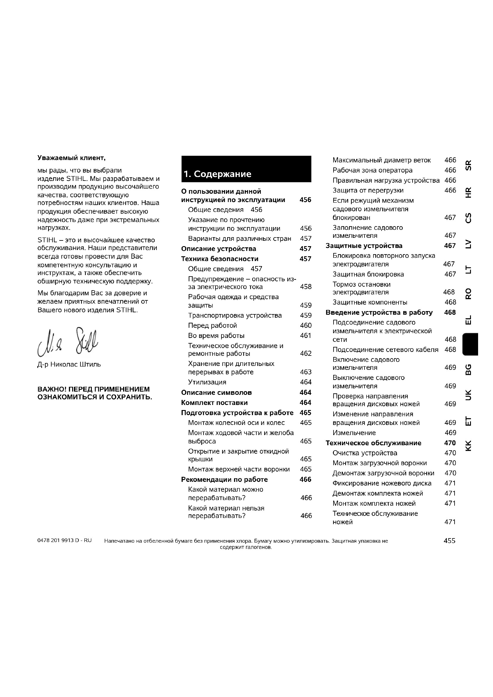 О пользовании данной инструкцией по эксплуатации 456 Общие сведения 456 Указание по прочтению инструкции по эксплуатации 456 Варианты для различных стран 457 Описание устройства 457 Техника безопасности 457 Общие сведения 457 Предупреждение – опасность из- за электрического тока 458 Рабочая одежда и средства защиты 459 Транспортировка устройства 459 Перед работой 460 Во время работы 461 Техническое обслуживание и ремонтные работы 462 Хранение при длительных перерывах в работе 463 Утилизация 464 Описание символов 464 Комплект поставки 464 Подготовка устройства к работе 465 Монтаж колесной оси и колес 465 Монтаж ходовой части и желоба выброса 465 Открытие и закрытие откидной крышки 465 Монтаж верхней части воронки 465 Рекомендации по работе 466 Какой материал можно перерабатывать?466 Какой материал нельзя перерабатывать?466 Максимальный диаметр веток 466 Рабочая зона оператора 466 Правильная нагрузка устройства 466 Защита от перегрузки 466 Если режущий механизм садового измельчителя блокирован 467 Заполнение садового измельчителя 467 Защитные устройства 467 Блокировка повторного запуска электродвигателя 467 Защитная блокировка 467 Тормоз остановки электродвигателя 468 Защитные компоненты 468 Введение устройства в работу 468 Подсоединение садового измельчителя к электрической сети 468 Подсоединение сетевого кабеля 468 Включение садового измельчителя 469 Выключение садового измельчителя 469 Проверка направления вращения дисковых ножей 469 Изменение направления вращения дисковых ножей 469 Измельчение 469 Техническое обслуживание 470 Очистка устройства 470 Монтаж загрузочной воронки 470 Демонтаж загрузочной воронки 470 Фиксирование ножевого диска 471 Демонтаж комплекта ножей 471 Монтаж комплекта ножей 471 Техническое обслуживание ножей 4710478 201 9913 D - RU
