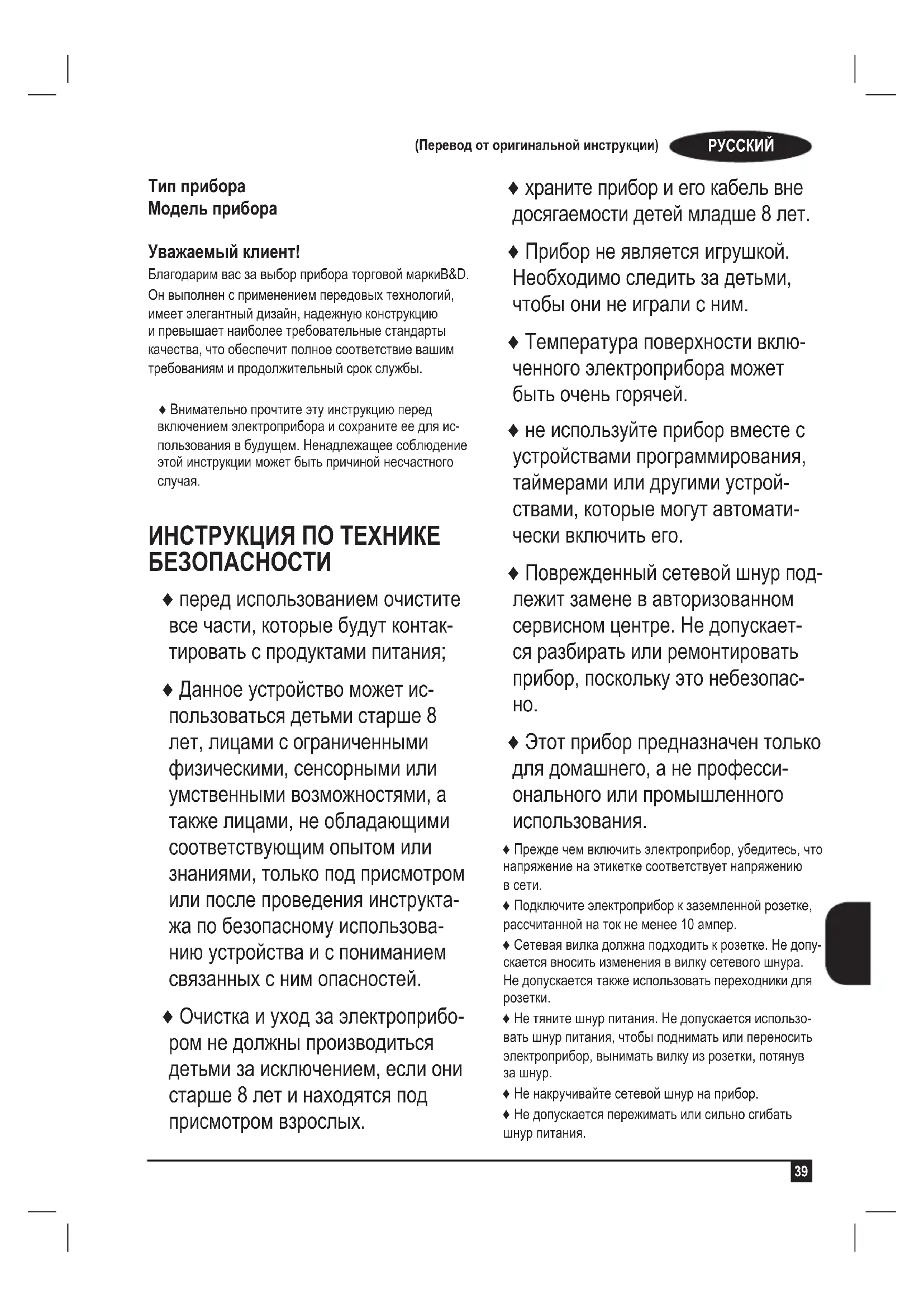 Тип прибора Модель прибора Уважаемый клиент! Благодарим вас за выбор прибора торговой маркиB&D. Он выполнен с применением передовых технологий, имеет элегантный дизайн, надежную конструкцию и превышает наиболее требовательные стандарты качества, что обеспечит полное соответствие вашим требованиям и продолжительный срок службы. ♦ Внимательно прочтите эту инструкцию перед включением электроприбора и сохраните ее для ис- пользования в будущем. Ненадлежащее соблюдение этой инструкции может быть причиной несчастного