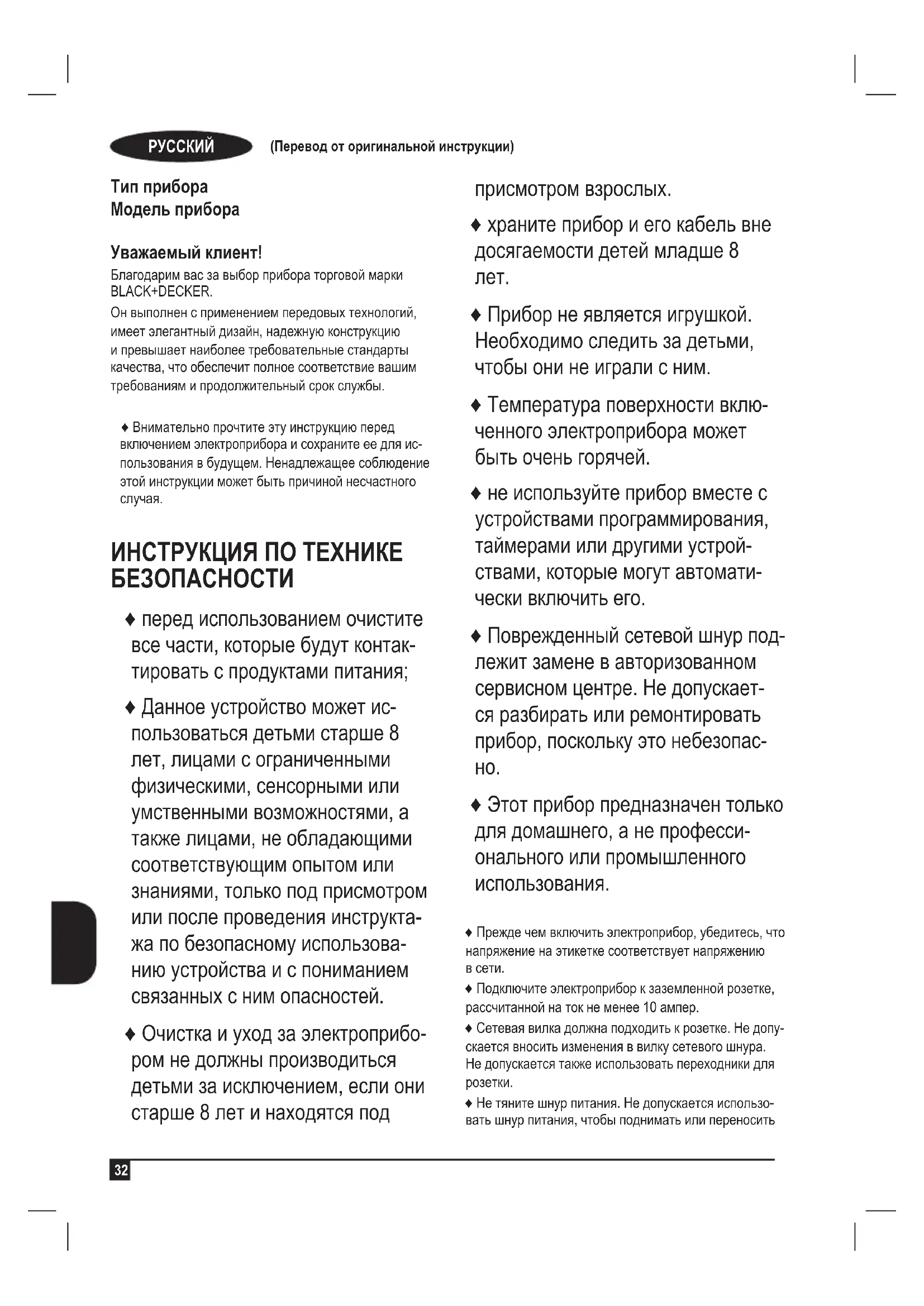 Тип прибора Модель прибора Уважаемый клиент! Благодарим вас за выбор прибора торговой марки BLACK+DECKER. Он выполнен с применением передовых технологий, имеет элегантный дизайн, надежную конструкцию и превышает наиболее требовательные стандарты качества, что обеспечит полное соответствие вашим требованиям и продолжительный срок службы. ♦ Внимательно прочтите эту инструкцию перед включением электроприбора и сохраните ее для ис- пользования в будущем. Ненадлежащее соблюдение этой инструкции может быть причиной несчастного