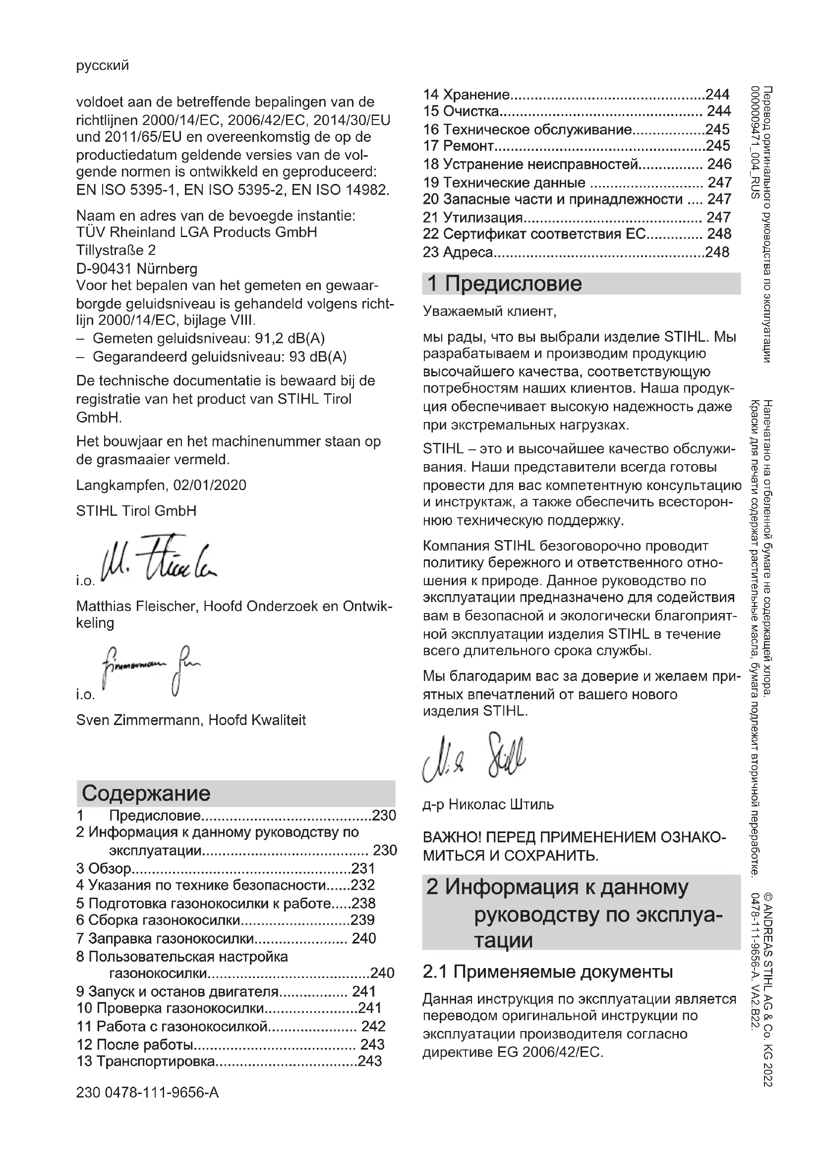 Данная инструкция по эксплуатации является переводом оригинальной инструкции по эксплуатации производителя согласно директиве EG 2006/42/EC. pyccкий 230 0478-111-9656-A © ANDREAS STIHL AG & Co. KG 2022 0478-111-9656-A. VA2.B22. Напечатано на отбеленной бумаге не содержащей хлора. Краски для печати содержат растительные масла, бумага подлежит вторичной переработке. Перевод оригинального руководства по эксплуатации 0000009471_004_RUSПрименяются местные правила техники без‐