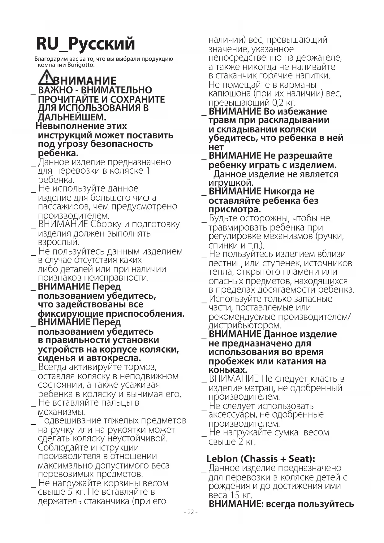 _ ВНИМАНИЕ Не следует класть в изделие матрац, не одобренный производителем. _ Не следует использовать аксессуары, не одобренные производителем. _ Не нагружайте сумка весом свыше 2 кг. Leblon (Chassis + Seat): _ Данное изделие предназначено для перевозки в коляске детей с рождения и до достижения ими веса 15 кг. _ ВНИМАНИЕ: всегда пользуйтесь- 23 - системой предохранительного крепления. Всегда используйте систему ремней с пятиточечным креплением. Всегда блокируйте поясной ремень с помощью лямки, проходящей между ногами. _ Передний бампер не предназначен для выдерживания веса ребенка. Передний бампер не предназначен для приподнимания сиденья вместе с сидящим в нем ребенком. Передний бампер не заменяет собой ремень безопасности. _ ВНИМАНИЕ! Не используйте дождевик в закрытых помещениях и проверяйте, чтобы ребенку не было слишком жарко. Не размещайте его вблизи источников тепла и будьте осторожны с сигаретами. Дождевик нельзя использовать на коляске без капюшона или зонтика, к которому его можно было бы прикрепить. Используйте дождевик только под присмотром взрослого. Проверьте, чтобы дождевик не касался движущихся частей шасси или коляски. Снимите дождевик, прежде чем складывать шасси или коляску. Leblon Chassis + автокресло: предназначено для детей от рождения весом до 13 кг. При использовании с автокреслом изделие не заменяет колыбель или кроватку. На сон ребенка нужно переложить в люльку коляски, колыбель или кроватку. _ ВНИМАНИЕ При установке детского автокресла в автомобиль убедитесь, что к автокреслу не прикреплены адаптеры. Перед установкой детского автокресла в автомобиль обязательно снимайте с него адаптеры. Leblon Chassis + Bassinet: предназначено для детей от рождения весом до 9 кг. При использовании в сочетании с корпусом коляски: изделие подходит для детей, которые не могут самостоятельно сидеть и подниматься на четвереньки, а также переворачиваться. Максимальный вес ребенка: 9 кг. Во время использования ручку для переноски (при наличии) следует держать вне корпуса коляски, чтобы она была недоступна для ребенка. Изображения тканевых элементов могут отличаться от приобретенного изделия.