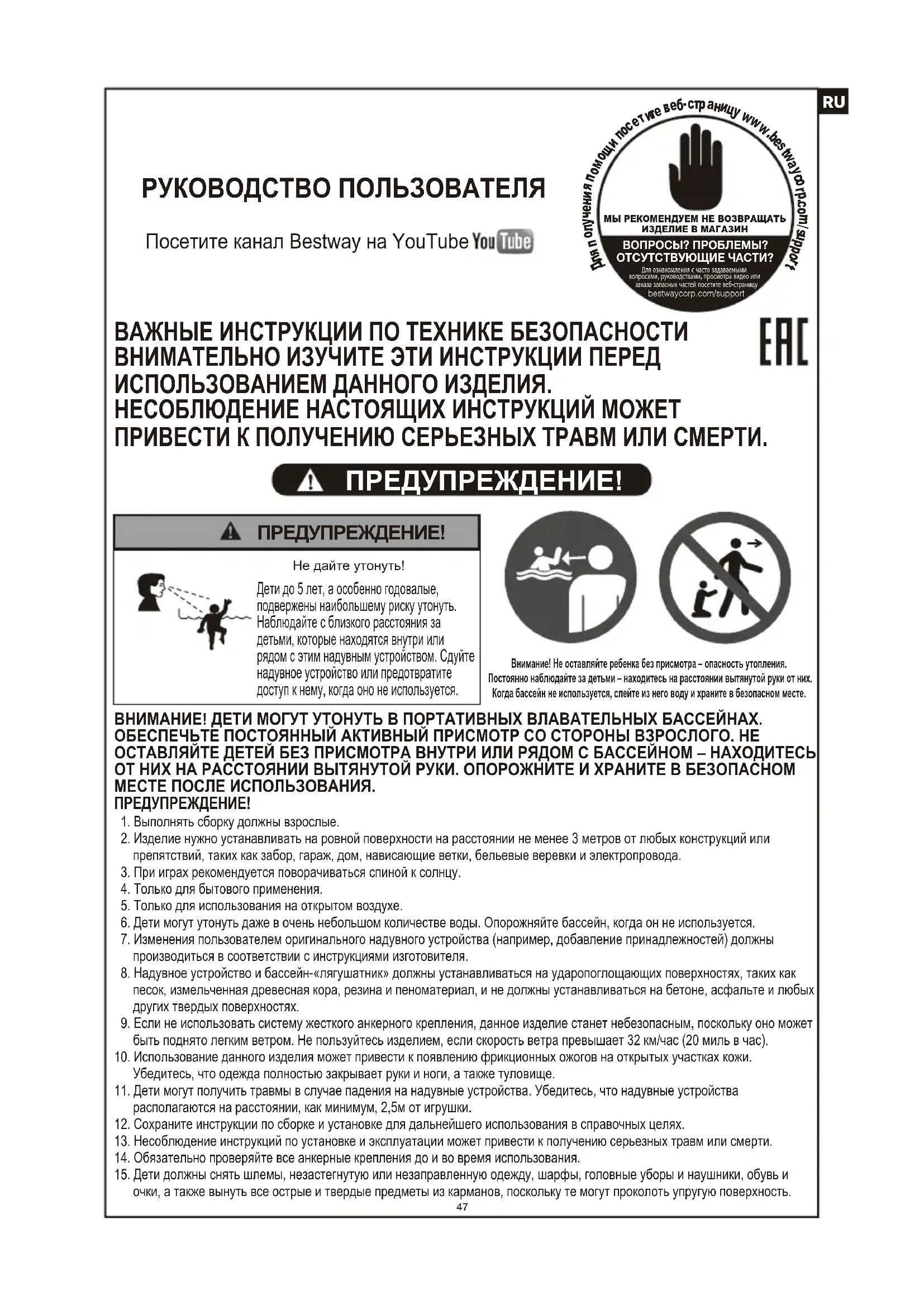 ВАЖНЫЕ ИНСТРУКЦИИ ПО ТЕХНИКЕ БЕЗОПАСНОСТИ ВНИМАТЕЛЬНО ИЗУЧИТЕ ЭТИ ИНСТРУКЦИИ ПЕРЕД ИСПОЛЬЗОВАНИЕМ ДАННОГО ИЗДЕЛИЯ. НЕСОБЛЮДЕНИЕ НАСТОЯЩИХ ИНСТРУКЦИЙ МОЖЕТ ПРИВЕСТИ К ПОЛУЧЕНИЮ СЕРЬЕЗНЫХ ТРАВМ ИЛИ СМЕРТИ. ПРЕДУПРЕЖДЕНИЕ! Внимание! Не оставляйте ребенка без присмотра – опасность утопления.Постоянно наблюдайте за детьми – находитесь на расстоянии вытянутой руки от них.Когда бассейн не используется, слейте из него воду и храните в безопасном месте.Не дайте утонуть!ПРЕДУПРЕЖДЕНИЕ!Дети до 5 лет, а особенно годовалые, подвержены наибольшему риску утонуть. Наблюдайте с близкого расстояния за детьми, которые находятся внутри или рядом с этим надувным устройством. Сдуйте надувное устройство или предотвратите доступ к нему, когда оно не используется.ВНИМАНИЕ! ДЕТИ МОГУТ УТОНУТЬ В ПОРТАТИВНЫХ ВЛАВАТЕЛЬНЫХ БАССЕЙНАХ. ОБЕСПЕЧЬТЕ ПОСТОЯННЫЙ АКТИВНЫЙ ПРИСМОТР СО СТОРОНЫ ВЗРОСЛОГО. НЕ ОСТАВЛЯЙТЕ ДЕТЕЙ БЕЗ ПРИСМОТРА ВНУТРИ ИЛИ РЯДОМ С БАССЕЙНОМ – НАХОДИТЕСЬ ОТ НИХ НА РАССТОЯНИИ ВЫТЯНУТОЙ РУКИ. ОПОРОЖНИТЕ И ХРАНИТЕ В БЕЗОПАСНОМ МЕСТЕ ПОСЛЕ ИСПОЛЬЗОВАНИЯ.ПРЕДУПРЕЖДЕНИЕ! 1. Выполнять сборку должны взрослые. 2. Изделие нужно устанавливать на ровной поверхности на расстоянии не менее 3 метров от любых конструкций или препятствий, таких как забор, гараж, дом, нависающие ветки, бельевые веревки и электропровода. 3. При играх рекомендуется поворачиваться спиной к солнцу. 4. Только для бытового применения. 5. Только для использования на открытом воздухе. 6. Дети могут утонуть даже в очень небольшом количестве воды. Опорожняйте бассейн, когда он не используется. 7. Изменения пользователем оригинального надувного устройства (например, добавление принадлежностей) должны производиться в соответствии с инструкциями изготовителя. 8. Надувное устройство и бассейн-«лягушатник» должны устанавливаться на ударопоглощающих поверхностях, таких как песок, измельченная древесная кора, резина и пеноматериал, и не должны устанавливаться на бетоне, асфальте и любых других твердых поверхностях. 9. Если не использовать систему жесткого анкерного крепления, данное изделие станет небезопасным, поскольку оно может быть поднято легким ветром. Не пользуйтесь изделием, если скорость ветра превышает 32 км/час (20 миль в час).10. Использование данного изделия может привести к появлению фрикционных ожогов на открытых участках кожи. Убедитесь, что одежда полностью закрывает руки и ноги, а также туловище.11. Дети могут получить травмы в случае падения на надувные устройства. Убедитесь, что надувные устройства располагаются на расстоянии, как минимум, 2,5м от игрушки.12. Сохраните инструкции по сборке и установке для дальнейшего использования в справочных целях.13. Несоблюдение инструкций по установке и эксплуатации может привести к получению серьезных травм или смерти.14. Обязательно проверяйте все анкерные крепления до и во время использования.15. Дети должны снять шлемы, незастегнутую или незаправленную одежду, шарфы, головные уборы и наушники, обувь и очки, а также вынуть все острые и твердые предметы из карманов, поскольку те могут проколоть упругую поверхность.