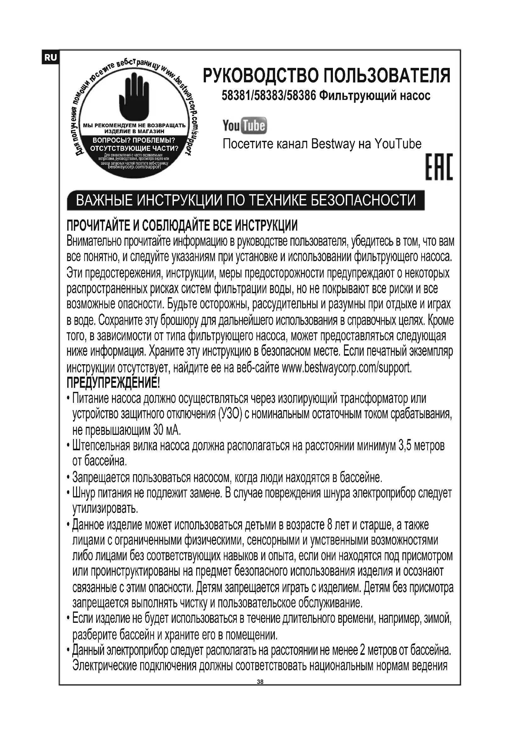 Посетите канал Bestway на YouTube РУКОВОДСТВО ПОЛЬЗОВАТЕЛЯ 58381/58383/58386 Фильтрующий насос ПРОЧИТАЙТЕ И СОБЛЮДАЙТЕ ВСЕ ИНСТРУКЦИИ Внимательно прочитайте информацию в руководстве пользователя, убедитесь в том, что вам все понятно, и следуйте указаниям при установке и использовании фильтрующего насоса. Эти предостережения, инструкции, меры предосторожности предупреждают о некоторых распространенных рисках систем фильтрации воды, но не покрывают все риски и все возможные опасности. Будьте осторожны, рассудительны и разумны при отдыхе и играх в воде. Сохраните эту брошюру для дальнейшего использования в справочных целях. Кроме того, в зависимости от типа фильтрующего насоса, может предоставляться следующая ниже информация. Храните эту инструкцию в безопасном месте. Если печатный экземпляр инструкции отсутствует, найдите ее на веб-сайте www.bestwaycorp.com/support. ПРЕДУПРЕЖДЕНИЕ!