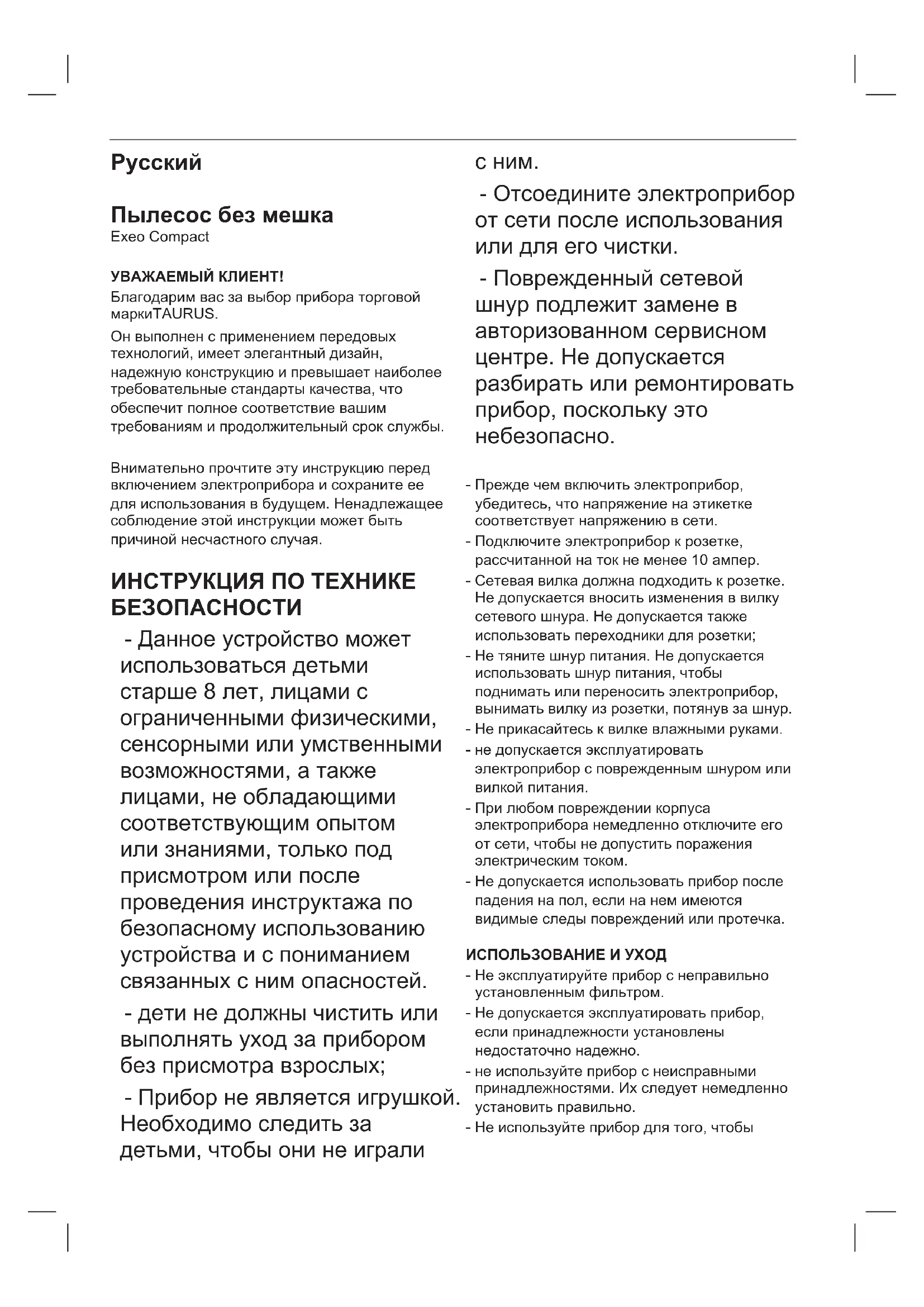 80dB Ονομαστική ισχύς εισόδου 800W Για να προσδιορισθεί η συμμόρφωση με τις απαιτήσεις οικολογικού σχεδιασμού και για τον υπολογισμό των παραμέτρων της ενεργειακής σήμανσης, η συσκευή θεωρείται γενικής χρήσης ηλεκτρική σκούπα και έχει ληφθεί ως αναφορά οι ευρωπαϊκοί κανονισμοί EN 60312-1, EN 60704-2- 1 και EN 60335-2-2 Το παρόν προϊόν συμμορφώνεται με την οδηγία 2014/35/ΕE χαμηλής τάσης, με την οδηγία 2014/30/ΕE για την ηλεκτρομαγνητική συμβατότητα, με την οδηγία 2011/65/ΕΕ για τον περιορισμό της χρήσης ορισμένων επικίνδυνων ουσιών σε ηλεκτρικό και ηλεκτρονικό εξοπλισμό και με την οδηγία 2009/125/ΕΚ για τις απαιτήσεις οικολογικού σχεδιασμού όσον αφορά τα συνδεόμενα με την ενέργεια προϊόντα.Русский Пылесос без мешка Exeo Compact УВАЖАЕМЫЙ КЛИЕНТ! Благодарим вас за выбор прибора торговой маркиTAURUS. Он выполнен с применением передовых технологий, имеет элегантный дизайн, надежную конструкцию и превышает наиболее требовательные стандарты качества, что обеспечит полное соответствие вашим требованиям и продолжительный срок службы. Внимательно прочтите эту инструкцию перед включением электроприбора и сохраните ее для использования в будущем. Ненадлежащее соблюдение этой инструкции может быть причиной несчастного случая. ИНСТРУКЦИЯ ПО ТЕХНИКЕ БЕЗОПАСНОСТИ - Данное устройство может использоваться детьми старше 8 лет, лицами с ограниченными физическими, сенсорными или умственными возможностями, а также лицами, не обладающими соответствующим опытом или знаниями, только под присмотром или после проведения инструктажа по безопасному использованию устройства и с пониманием связанных с ним опасностей. - дети не должны чистить или выполнять уход за прибором без присмотра взрослых; - Прибор не является игрушкой. Необходимо следить за детьми, чтобы они не играли