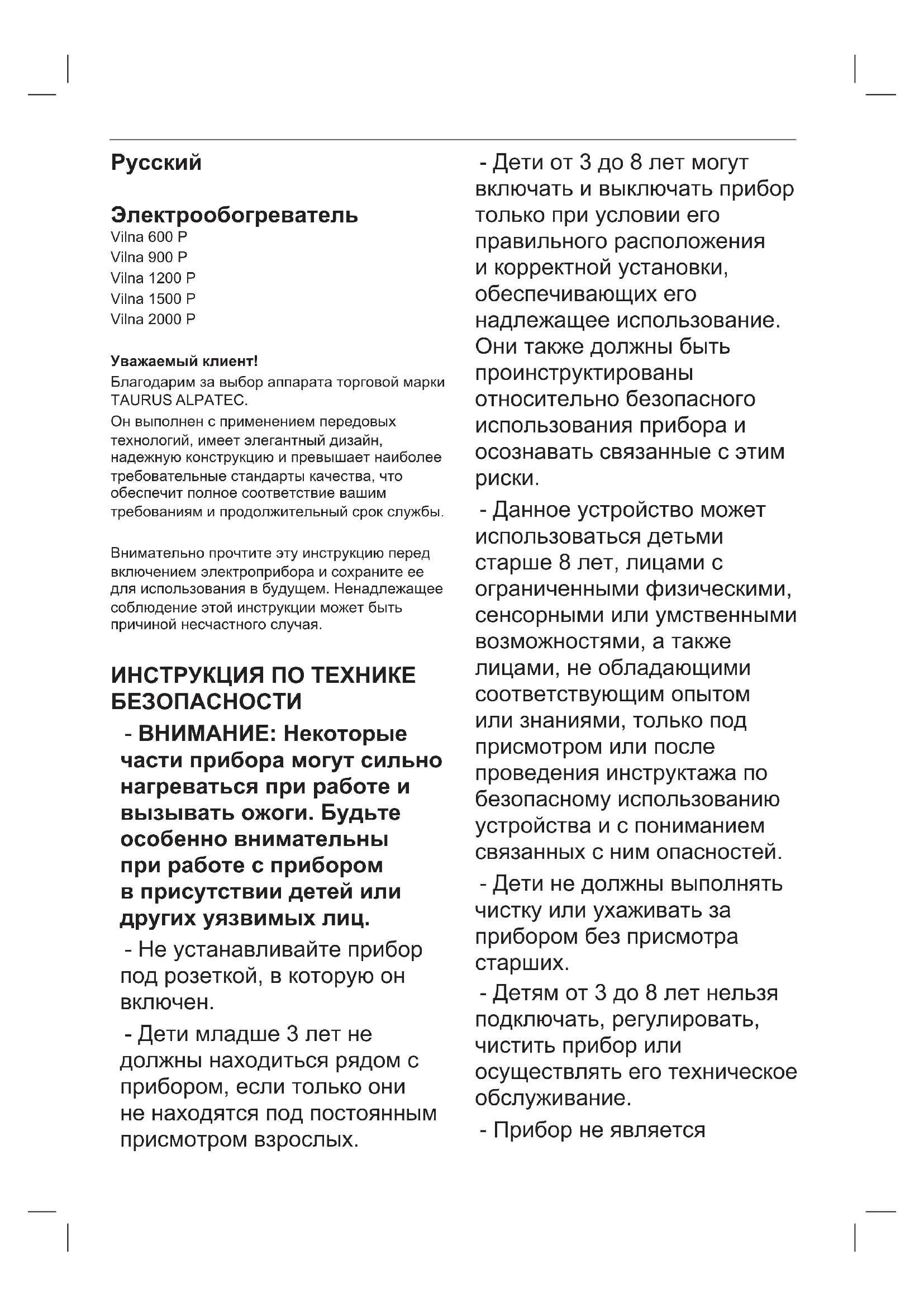 Με επιλογή εξ αποστάσεως ελέγχου Όχι Με έλεγχο ρυθμιζόμενης ενεργοποίησης Όχι Με περιορισμό του χρόνου λειτουργίας Όχι Με αισθητήρα μελανού φωτός Όχι Electrodomésticos Taurus, S.L. Avda. Barcelona, S/N, 25790 Oliana, lleida, SpainРусский Электрообогреватель Vilna 600 P Vilna 900 P Vilna 1200 P Vilna 1500 P Vilna 2000 P Уважаемый клиент! Благодарим за выбор аппарата торговой марки TAURUS ALPATEC. Он выполнен с применением передовых технологий, имеет элегантный дизайн, надежную конструкцию и превышает наиболее требовательные стандарты качества, что обеспечит полное соответствие вашим требованиям и продолжительный срок службы. Внимательно прочтите эту инструкцию перед включением электроприбора и сохраните ее для использования в будущем. Ненадлежащее соблюдение этой инструкции может быть причиной несчастного случая. ИНСТРУКЦИЯ ПО ТЕХНИКЕ БЕЗОПАСНОСТИ - ВНИМАНИЕ: Некоторые части прибора могут сильно нагреваться при работе и вызывать ожоги. Будьте особенно внимательны при работе с прибором в присутствии детей или других уязвимых лиц. - Не устанавливайте прибор под розеткой, в которую он
