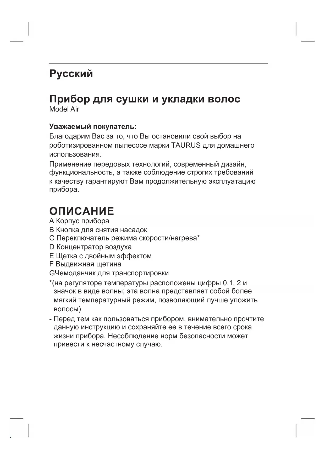 Model Air - фен TAURUS - Бесплатное руководство пользователя