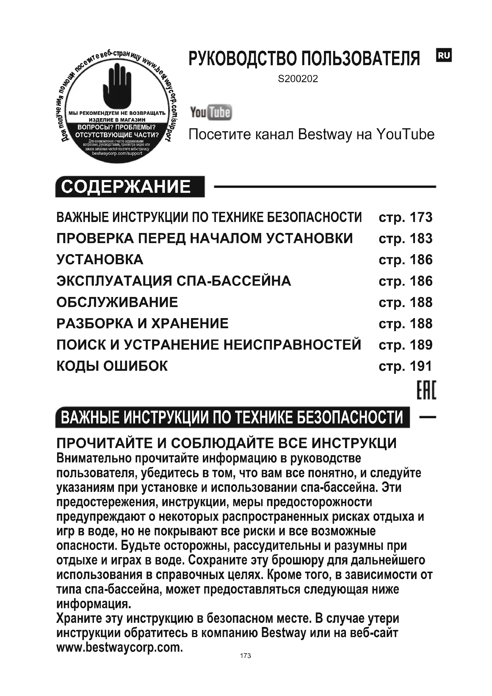 ЭКСПЛУАТАЦИЯ СПА-БАССЕЙНА ОБСЛУЖИВАНИЕ РАЗБОРКА И ХРАНЕНИЕ ПОИСК И УСТРАНЕНИЕ НЕИСПРАВНОСТЕЙ КОДЫ ОШИБОК стр. 173 стр. 183 стр. 186 стр. 186 стр. 188 стр. 188 стр. 189 стр. 191