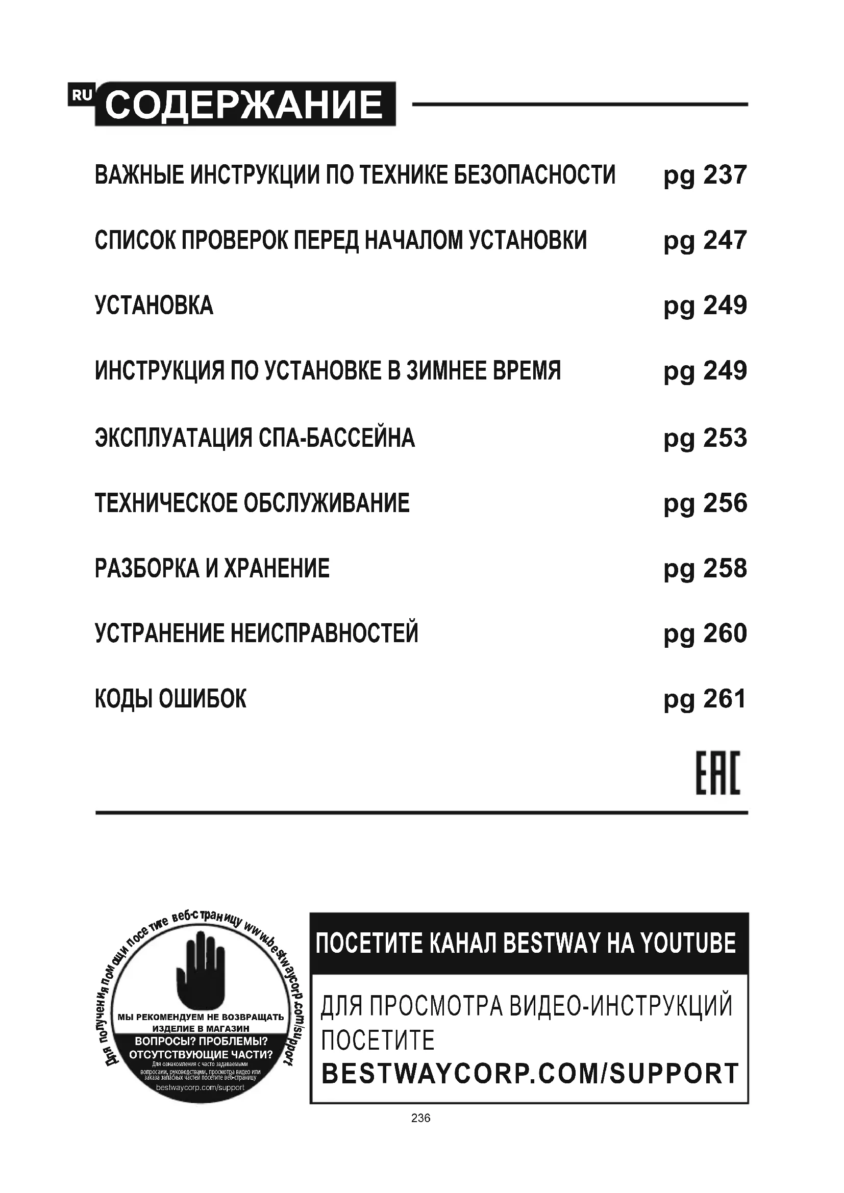 ΓΙΑ ΒΟΗΘΕΙΑ, ΕΠΙΣΚΕΦΘΕΙΤΕ ΤΟ ΤΜΗΜΑ ΥΠΟΣΤΗΡΙΞΗΣ ΣΤΗΝ ΙΣΤΟΣΕΛΙΔΑ ΜΑΣ, www.bestwaycorp.com ΚΩΔΙΚΟΙ ΣΦΑΛΜΑΤΩΝ 235СОДЕРЖАНИЕ ИНСТРУКЦИИ ПО ТЕХНИКЕ БЕЗОПАСНОСТИ Внимательно прочитайте информацию в руководстве пользователя, убедитесь в том, что вам все понятно, и следуйте указаниям при установке и использовании спа-бассейна. ВАЖНЫЕ ИНСТРУКЦИИ ПО ТЕХНИКЕ БЕЗОПАСНОСТИ. ПРОЧИТАЙТЕ И СОБЛЮДАЙТЕ ВСЕ ИНСТРУКЦИИ.
