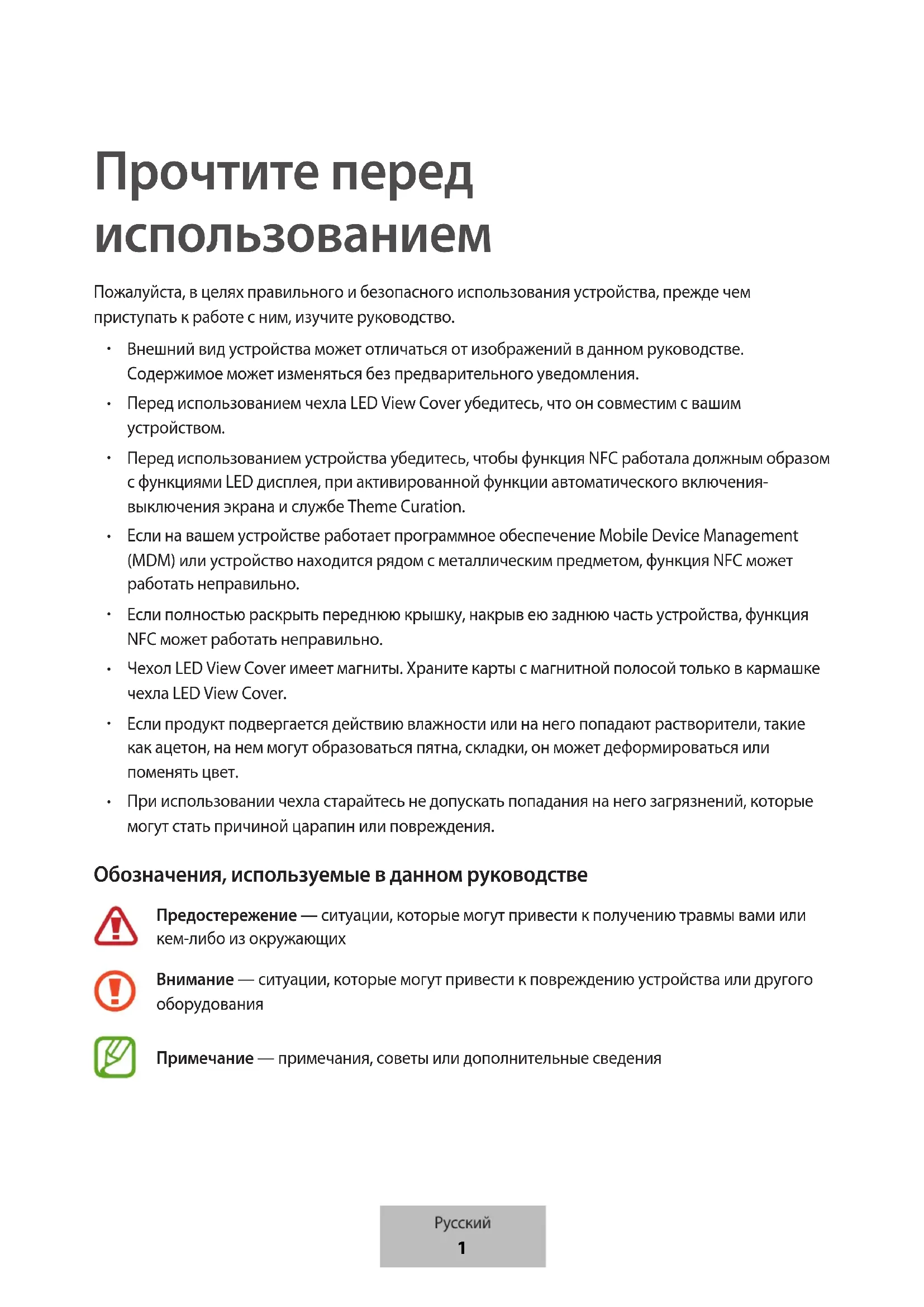 При использовании чехла старайтесь не допускать попадания на него загрязнений, которые могут стать причиной царапин или повреждения. Обозначения, используемые в данном руководстве Предостережение — ситуации, которые могут привести к получению травмы вами или кем-либо из окружающих Внимание — ситуации, которые могут привести к повреждению устройства или другого оборудования Примечание — примечания, советы или дополнительные сведения