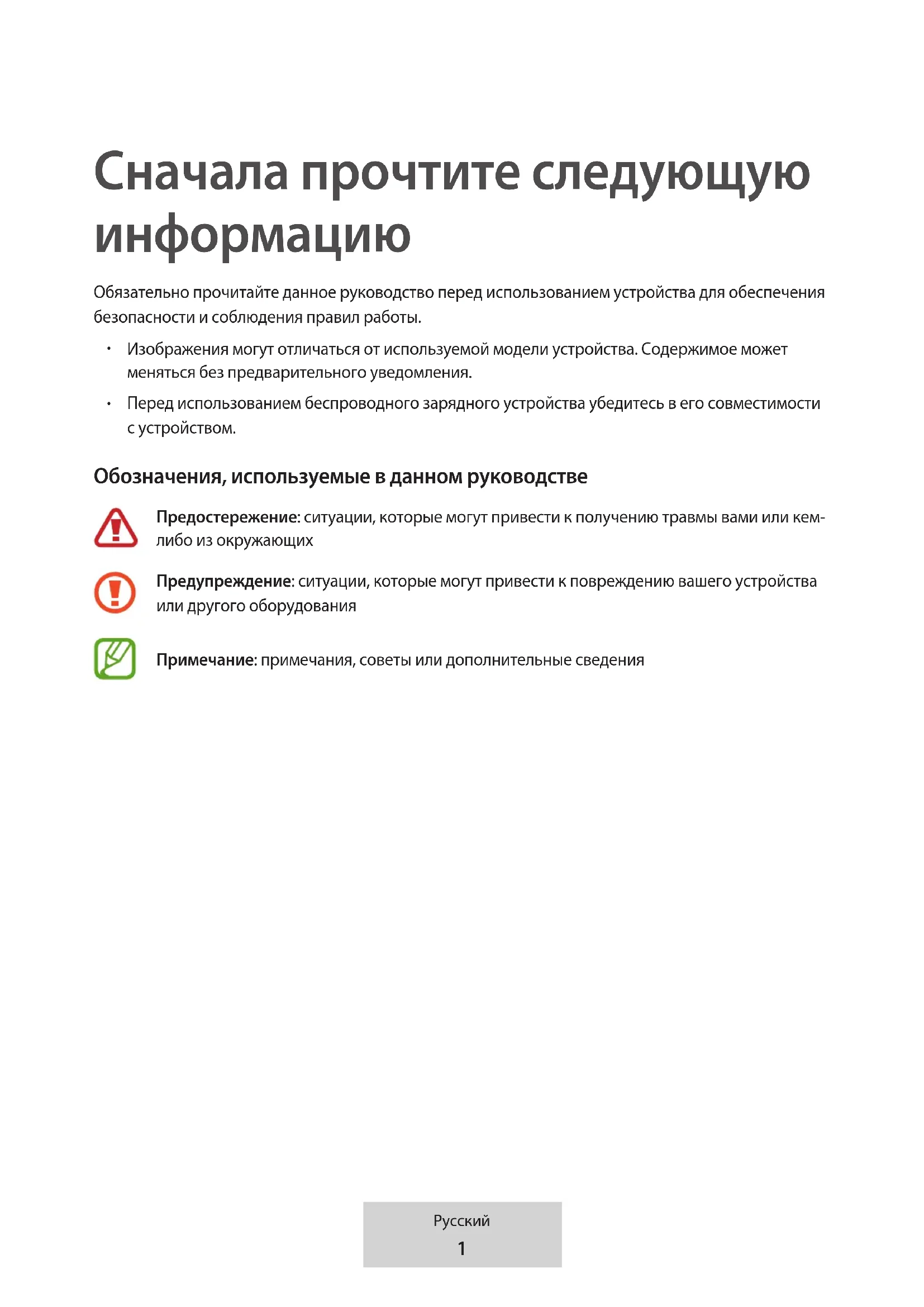Перед использованием беспроводного зарядного устройства убедитесь в его совместимости с устройством. Обозначения, используемые в данном руководстве Предостережение: ситуации, которые могут привести к получению травмы вами или кем- либо из окружающих Предупреждение: ситуации, которые могут привести к повреждению вашего устройства или другого оборудования Примечание: примечания, советы или дополнительные сведения2