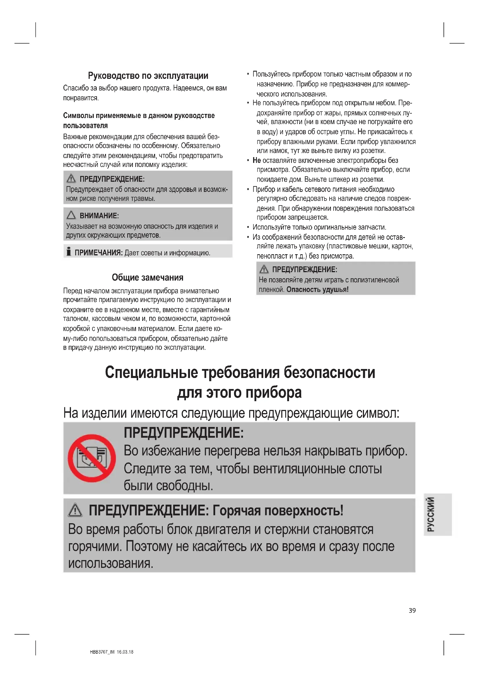 - Из соображений безопасности для детей не остав- ляйте лежать упаковку (пластиковые мешки, картон, пенопласт и т.д.) без присмотра. ПРЕДУПРЕЖДЕНИЕ: Не позволяйте детям играть с полиэтиленовой пленкой. Опасность удушья! Специальные требования безопасности для этого прибора На изделии имеются следующие предупреждающие символ: ПРЕДУПРЕЖДЕНИЕ: Во избежание перегрева нельзя накрывать прибор. Следите за тем, чтобы вентиляционные слоты были свободны. ПРЕДУПРЕЖДЕНИЕ: Горячая поверхность! Во время работы блок двигателя и стержни становятся горячими. Поэтому не касайтесь их во время и сразу после использования.HBB3707_IM 16.03.18