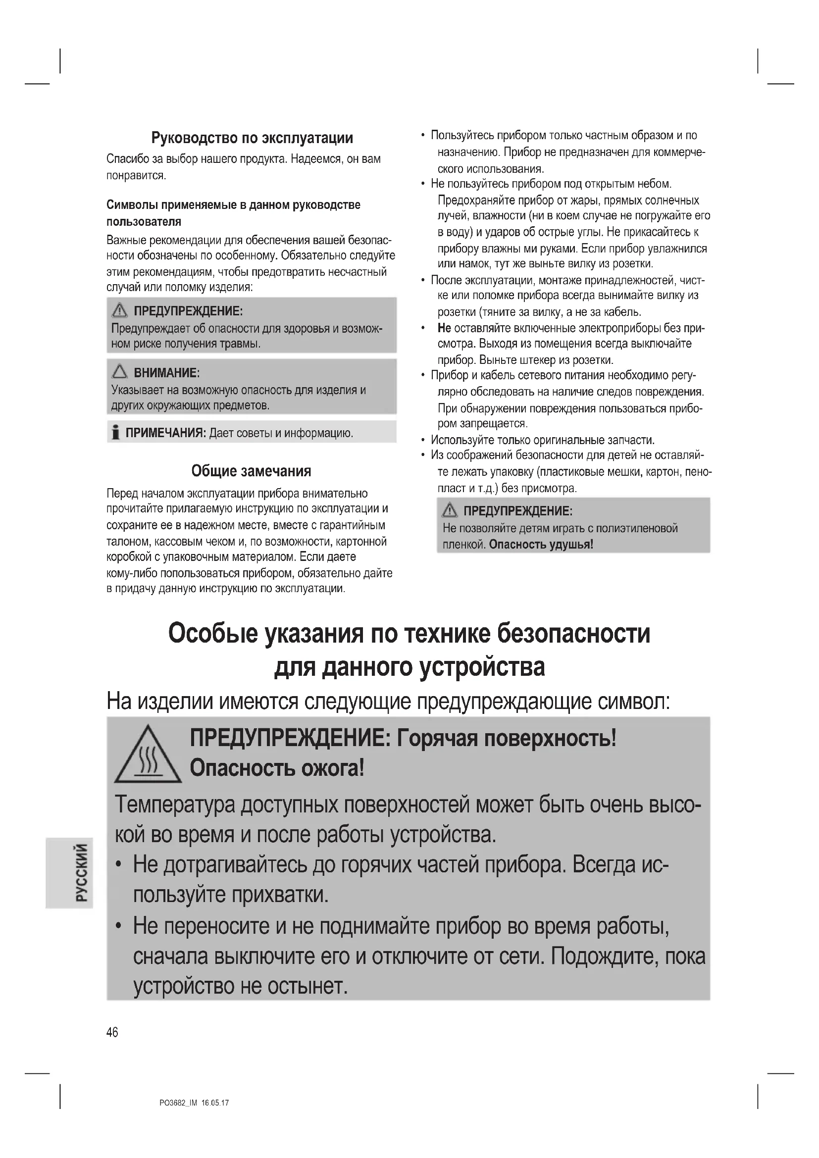 - Не переносите и не поднимайте прибор во время работы, сначала выключите его и отключите от сети. Подождите, пока устройство не остынет.47 PO3682_IM 16.05.17