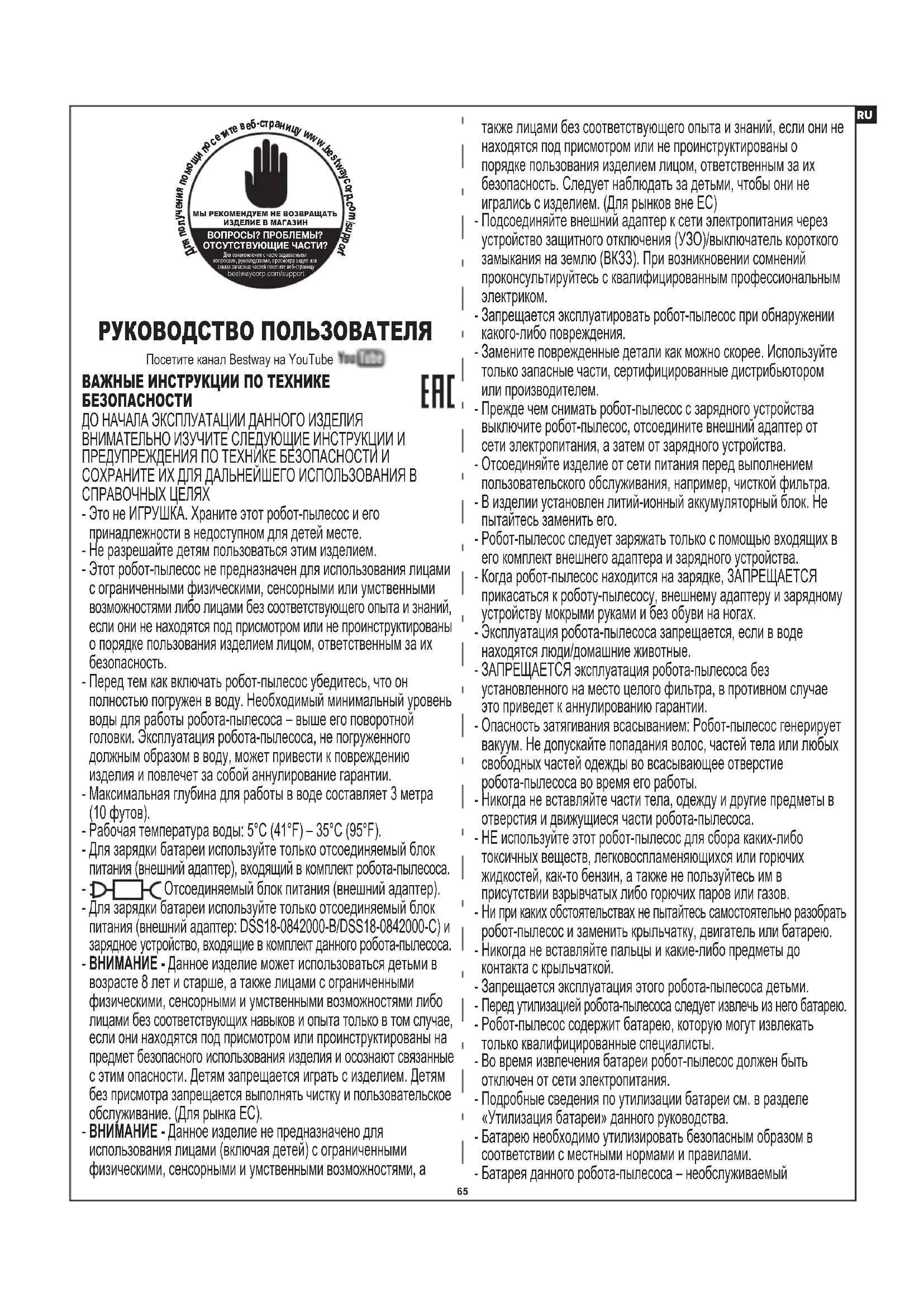 Посетите канал Bestway на YouTube РУКОВОДСТВО ПОЛЬЗОВАТЕЛЯ МЫ РЕКОМЕНДУЕМ НЕ ВОЗВРАЩАТЬИЗДЕЛИЕ В МАГАЗИНВОПРОСЫ? ПРОБЛЕМЫ?ОТСУТСТВУЮЩИЕ ЧАСТИ? Для ознакомления с часто задаваемыми вопросами, руководствами, просмотра видео или заказа запасных частей посетите веб-страницу bestwaycorp.com/support