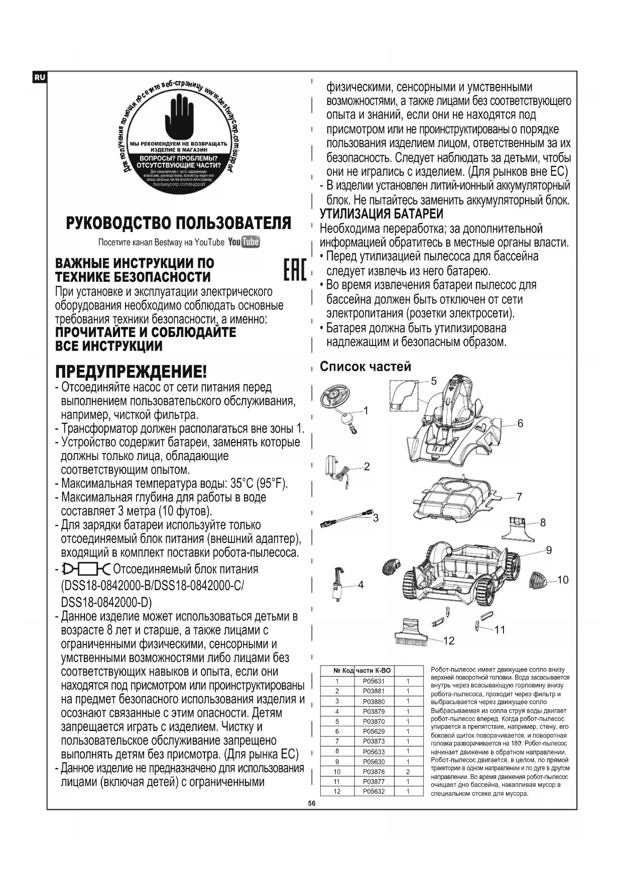 Скачайте инструкцию для вашего робот-пылесос в формате PDF бесплатно! Найдите своё руководство Flowclear 58482 - BESTWAY и возьмите своё электронное устройство обратно в руки. На этой странице опубликованы все документы, необходимые для использования вашего устройства. Flowclear 58482 бренда BESTWAY.