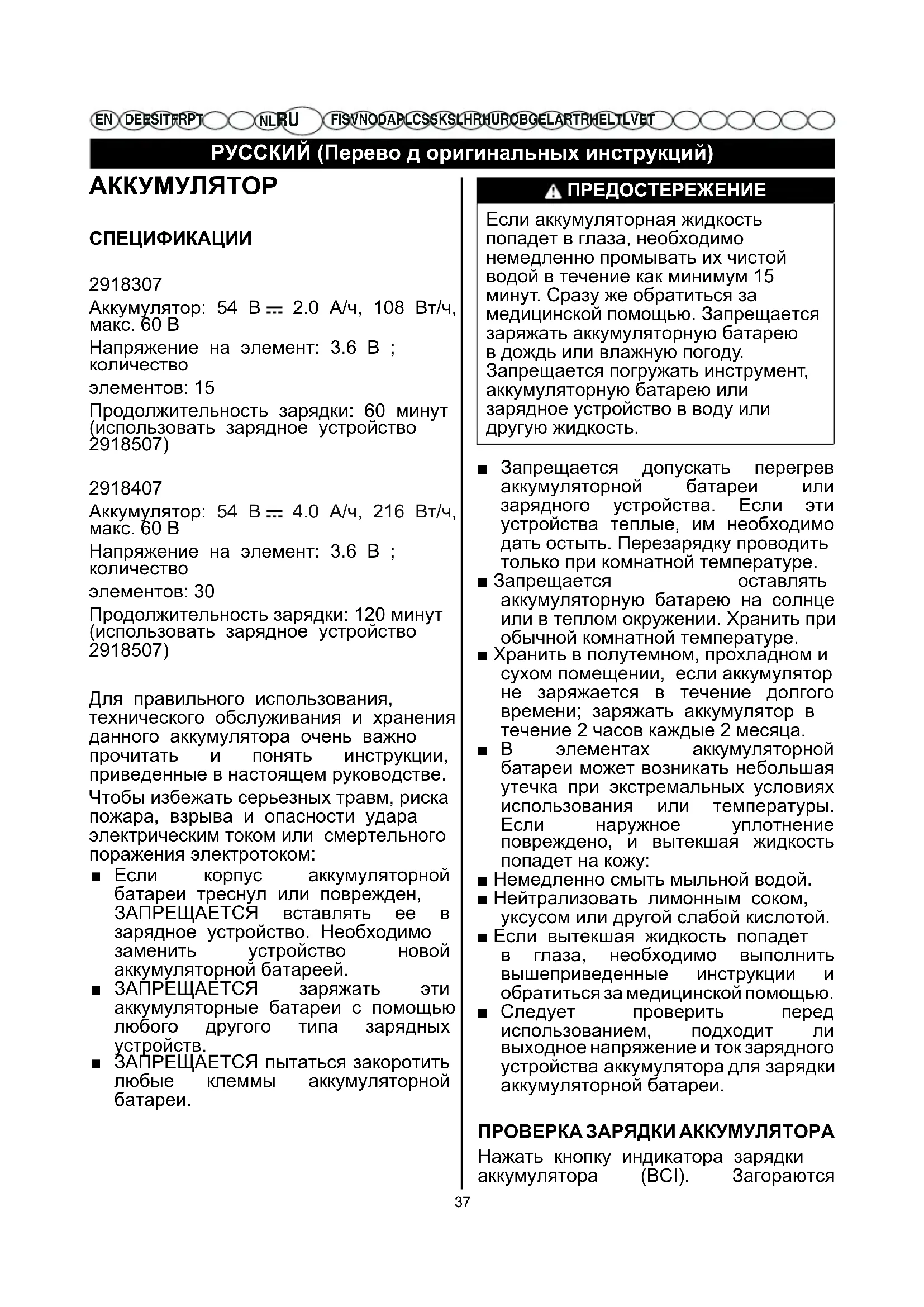 элементов: 30 Продолжительность зарядки: 120 минут (использовать зарядное устройство 2918507) Для правильного использования, технического обслуживания и хранения данного аккумулятора очень важно прочитать и понять инструкции, приведенные в настоящем руководстве. Чтобы избежать серьезных травм, риска пожара, взрыва и опасности удара электрическим током или смертельного поражения электротоком: ■ Если корпус аккумуляторной батареи треснул или поврежден, ЗАПРЕЩАЕТСЯ вставлять ее в зарядное устройство. Необходимо заменить устройство новой аккумуляторной батареей. ■ ЗАПРЕЩАЕТСЯ заряжать эти аккумуляторные батареи с помощью любого другого типа зарядных
