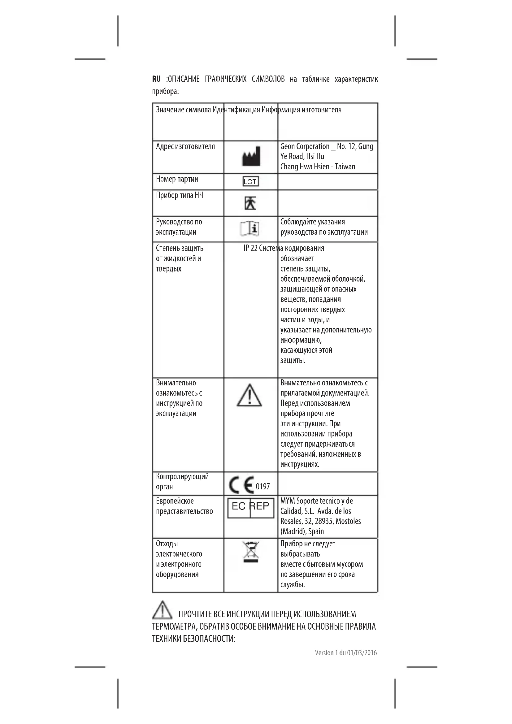 Значение символа Идентификация Информация изготовителя Адрес изготовителя Geon Corporation _ No. 12, Gung Ye Road, Hsi Hu Chang Hwa Hsien - Taiwan Номер партии LOT Прибор типа НЧ Руководство по эксплуатации Соблюдайте указания руководства по эксплуатации Степень защиты от жидкостей и