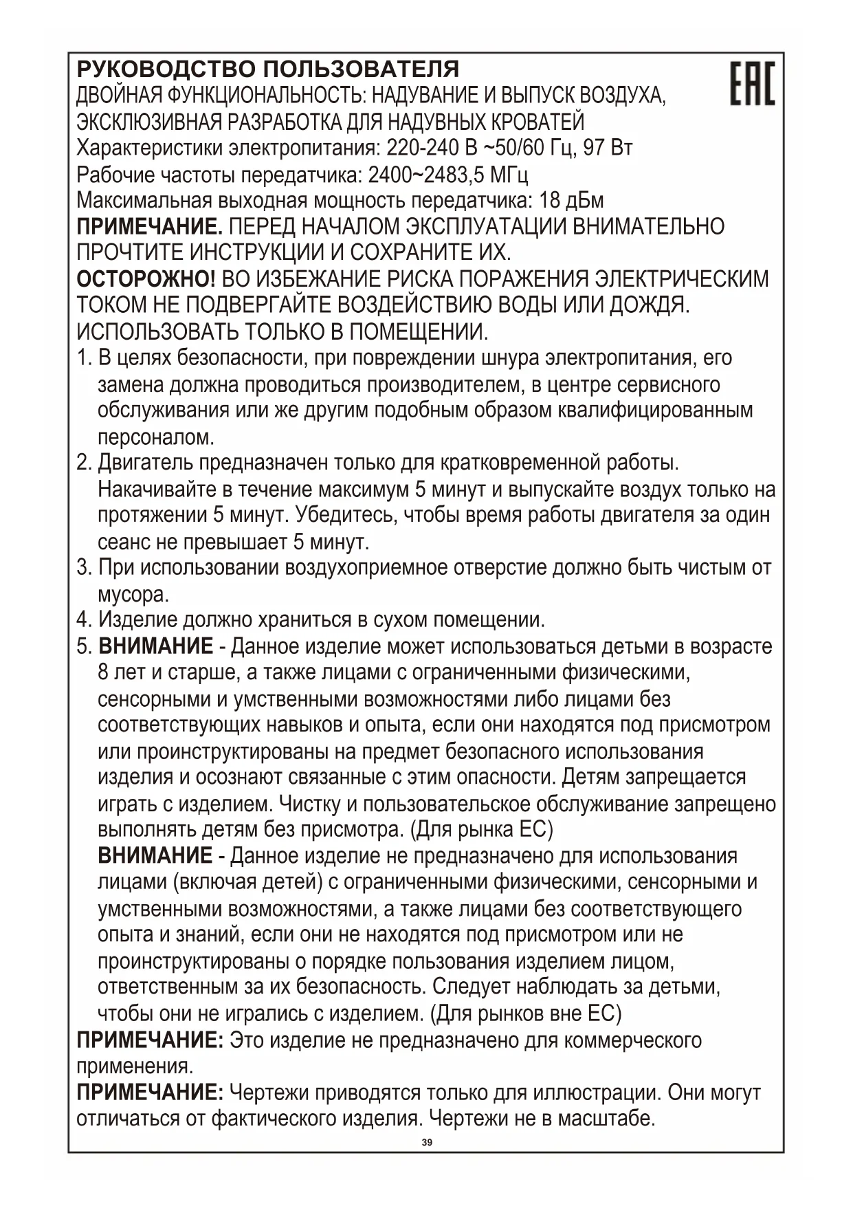 8 лет и старше, а также лицами с ограниченными физическими, сенсорными и умственными возможностями либо лицами без соответствующих навыков и опыта, если они находятся под присмотром или проинструктированы на предмет безопасного использования изделия и осознают связанные с этим опасности. Детям запрещается играть с изделием. Чистку и пользовательское обслуживание запрещено выполнять детям без присмотра. (Для рынка ЕС) ВНИМАНИЕ - Данное изделие не предназначено для использования лицами (включая детей) с ограниченными физическими, сенсорными и умственными возможностями, а также лицами без соответствующего опыта и знаний, если они не находятся под присмотром или не проинструктированы о порядке пользования изделием лицом, ответственным за их безопасность. Следует наблюдать за детьми, чтобы они не игрались с изделием. (Для рынков вне ЕС) ПРИМЕЧАНИЕ: Это изделие не предназначено для коммерческого применения. ПРИМЕЧАНИЕ: Чертежи приводятся только для иллюстрации. Они могут отличаться от фактического изделия. Чертежи не в масштабе.40 Инструкция по эксплуатации насоса: Примечание. Надувание и сдувание автоматически выключаются через 5 минут. Примечание. Нажмите и удерживайте в течение 2 секунд кнопку сдувания, чтобы включить сдувание. Примечание. Выходное напряжение и сила тока зарядного USB-порта составляют 5 В пост. тока и 1 A соответственно. При включенном питании через USB-порт можно заряжать различные устройства, например, сотовый телефон. Примечание. Когда насос надувает или сдувает матрас, нажмите кнопку « » или « », и насос выключится. Важно! Насос не должен работать более 5 минут за одно включение. После каждого включения основного насоса, он должен полностью охлаждаться. ЧИСТКА И ХРАНЕНИЕ: