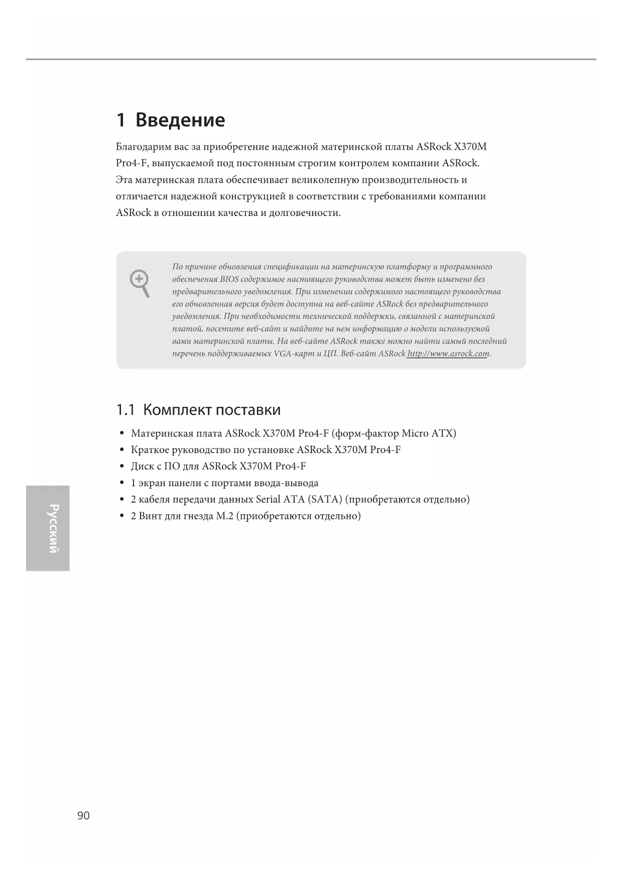 2 Винт для гнезда M.2 (приобретаются отдельно) По причине обновления спецификации на материнскую платформу и программного обеспечения BIOS содержимое настоящего руководства может быть изменено без предварительного уведомления. При изменении содержимого настоящего руководства его обновленная версия будет доступна на веб-сайте ASRock без предварительного уведомления. При необходимости технической поддержки, связанной с материнской платой, посетите веб-сайт и найдите на нем информацию о модели используемой вами материнской платы. На веб-сайте ASRock также можно найти самый последний перечень поддерживаемых VGA-карт и ЦП. Веб-сайт ASRock http://www.asrock.com.91