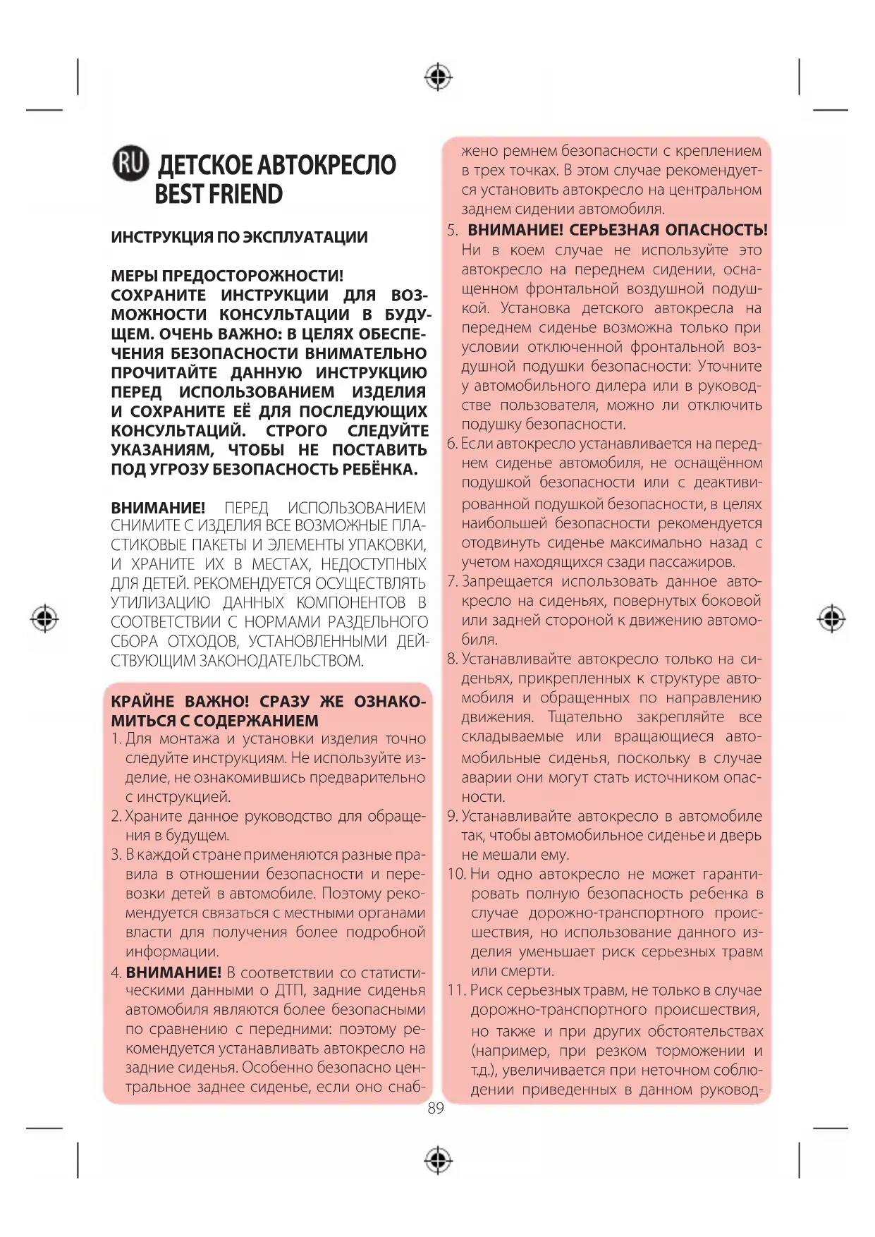30° C 30° CДЕТСКОЕ АВТОКРЕСЛО BEST FRIEND ИНСТРУКЦИЯ ПО ЭКСПЛУАТАЦИИ МЕРЫ ПРЕДОСТОРОЖНОСТИ! СОХРАНИТЕ ИНСТРУКЦИИ ДЛЯ ВОЗ- МОЖНОСТИ КОНСУЛЬТАЦИИ В БУДУ- ЩЕМ. ОЧЕНЬ ВАЖНО: В ЦЕЛЯХ ОБЕСПЕ- ЧЕНИЯ БЕЗОПАСНОСТИ ВНИМАТЕЛЬНО ПРОЧИТАЙТЕ ДАННУЮ ИНСТРУКЦИЮ ПЕРЕД ИСПОЛЬЗОВАНИЕМ ИЗДЕЛИЯ И СОХРАНИТЕ ЕЁ ДЛЯ ПОСЛЕДУЮЩИХ КОНСУЛЬТАЦИЙ. СТРОГО СЛЕДУЙТЕ УКАЗАНИЯМ, ЧТОБЫ НЕ ПОСТАВИТЬ ПОД УГРОЗУ БЕЗОПАСНОСТЬ РЕБЁНКА. ВНИМАНИЕ! ПЕРЕД ИСПОЛЬЗОВАНИЕМ СНИМИТЕ С ИЗДЕЛИЯ ВСЕ ВОЗМОЖНЫЕ ПЛА- СТИКОВЫЕ ПАКЕТЫ И ЭЛЕМЕНТЫ УПАКОВКИ, И ХРАНИТЕ ИХ В МЕСТАХ, НЕДОСТУПНЫХ ДЛЯ ДЕТЕЙ. РЕКОМЕНДУЕТСЯ ОСУЩЕСТВЛЯТЬ УТИЛИЗАЦИЮ ДАННЫХ КОМПОНЕНТОВ В СООТВЕТСТВИИ С НОРМАМИ РАЗДЕЛЬНОГО СБОРА ОТХОДОВ, УСТАНОВЛЕННЫМИ ДЕЙ- СТВУЮЩИМ ЗАКОНОДАТЕЛЬСТВОМ. КРАЙНЕ ВАЖНО! СРАЗУ ЖЕ ОЗНАКО- МИТЬСЯ С СОДЕРЖАНИЕМ