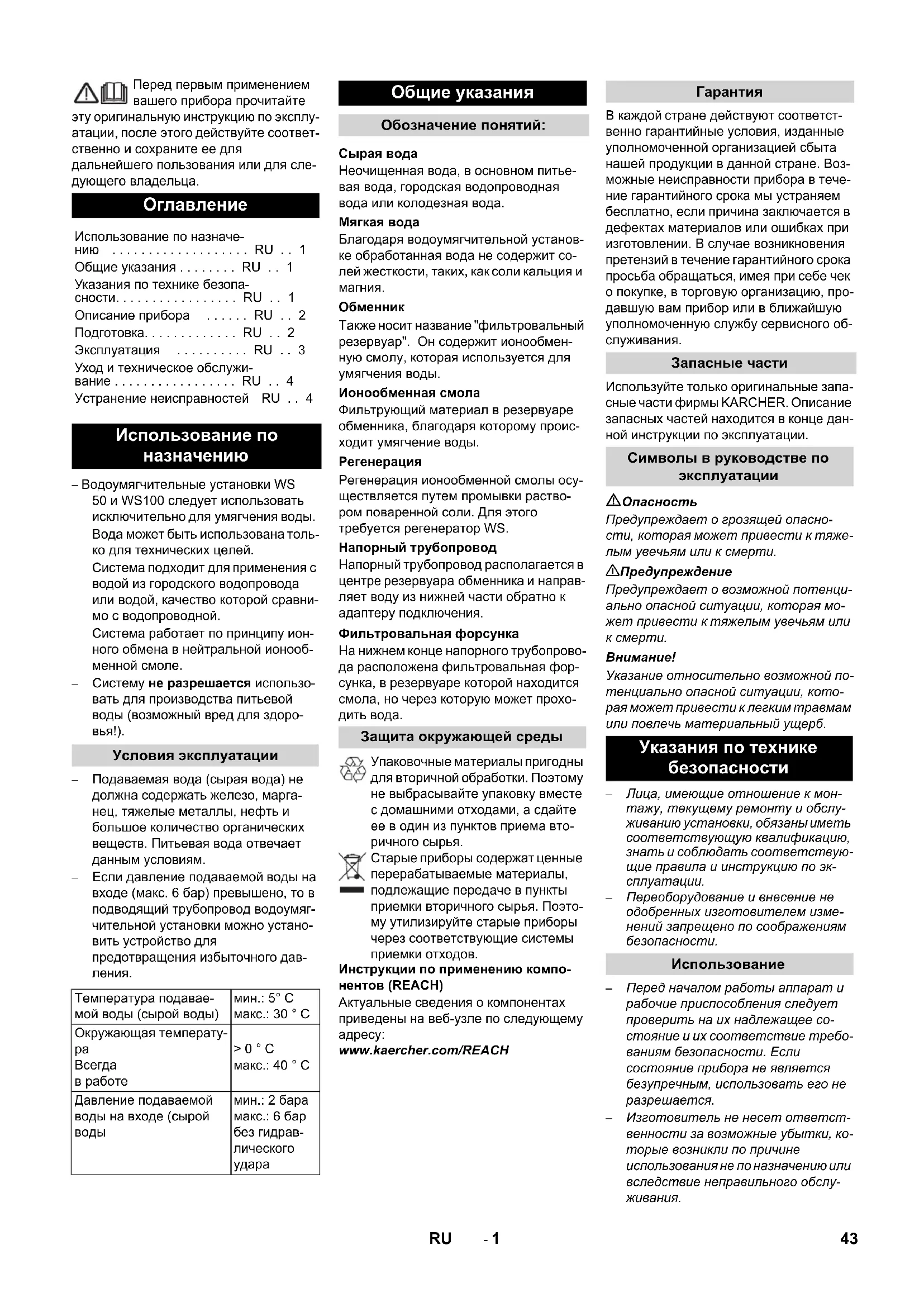5 10,0 20,0 10 5,0 10,0 12 4,2 8,3 14 3,6 7,1 16 3,1 6,3 18 2,8 5,6 20 2,5 5,0 22 2,3 4,5 Ölçüm saati Rejenerasyon Tükenen sistemin rejenerasyonu Tank içindeki reçine dolumunun değişti- rilmesi Koruma ve Bakım Genel bilgiler Donma tehlikesi Donma tehlikesinde tankın boşaltılması Bakım çalışmaları Çalışmadan önceki günlük kontroller Her 3 ayda bir bakım Arıza yardımı Yumuşak su yok Reçine çıkışı Sızdırma 42 TR- 1 Перед первым применением вашего прибора прочитайте эту оригинальную инструкцию по эксплу- атации, после этого действуйте соответ- ственно и сохраните ее для дальнейшего пользования или для сле- дующего владельца. – Водоумягчительные установки WS 50 и WS100 следует использовать исключительно для умягчения воды. Вода может быть использована толь- ко для технических целей. Система подходит для применения с водой из городского водопровода или водой, качество которой сравни- мо с водопроводной. Система работает по принципу ион- ного обмена в нейтральной ионооб- менной смоле. – Систему не разрешается использо- вать для производства питьевой воды (возможный вред для здоро-