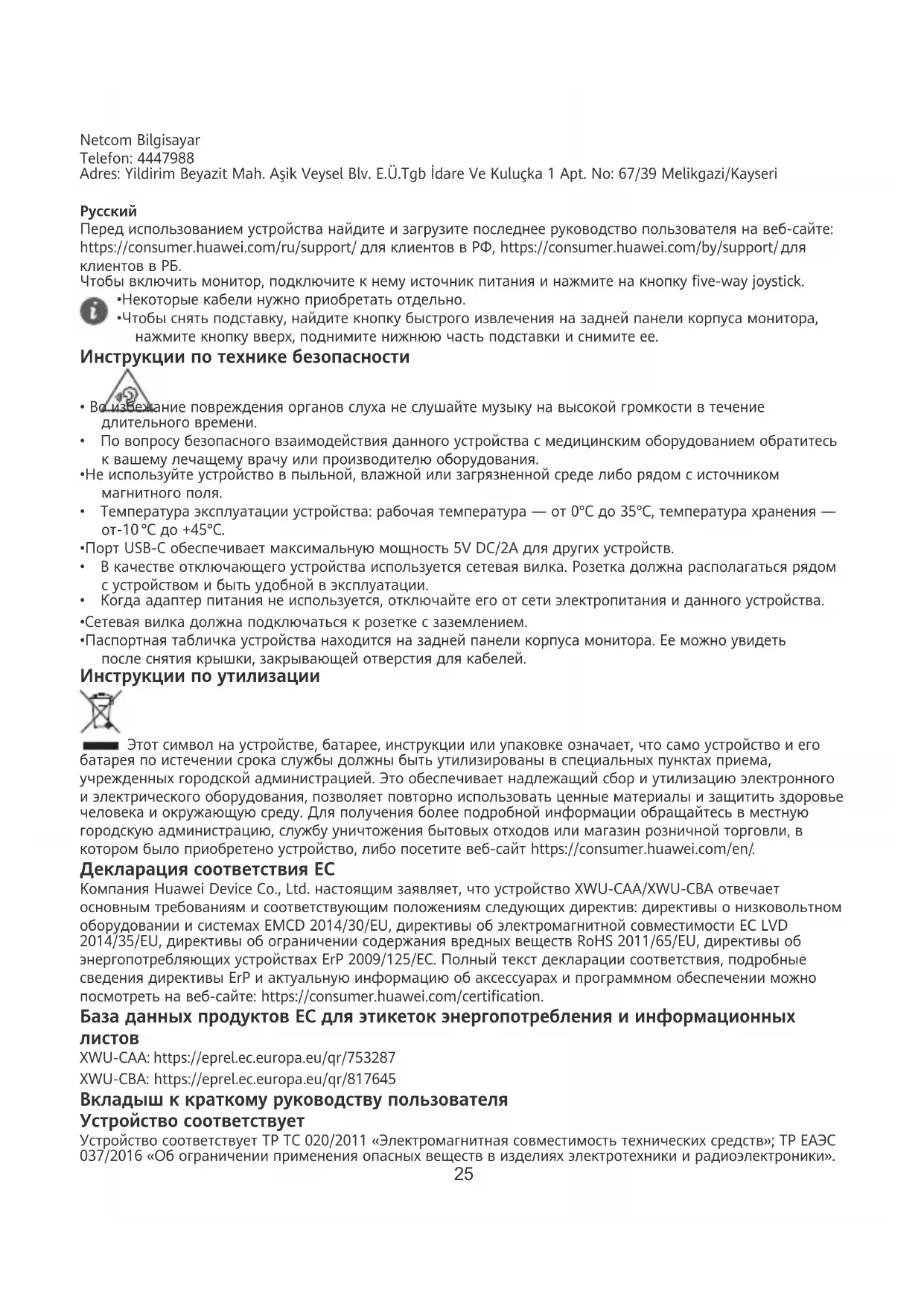 XWU-CAA: https://eprel.ec.europa.eu/qr/753287 XWU-CBA: https://eprel.ec.europa.eu/qr/817645 Вкладыш к краткому руководству пользователя Устройство соответствует Устройство соответствует ТР ТС 020/2011 «Электромагнитная совместимость технических средств»; ТР ЕАЭС 037/2016 «Об ограничении применения опасных веществ в изделиях электротехники и радиоэлектроники». 25Адаптер питания cоответствует ТР ТС 004/2011 «О безопасности низковольтного оборудования»; ТС 020/2011 «Электромагнитная совместимость технических средств»; ТР ЕАЭС 037/2016 «Об ограничении применения опасных веществ в изделиях электротехники и радиоэлектроники». Изготовитель Huawei Device Co., Ltd. Хуавэй Девайс Ко., Лтд. КНР, 523808, г. Дунгуань, Гуандун, Административное здание №2. Тел.: +86-755-28780808 Импортер в РФ ООО «Техкомпания Хуавэй», Российская Федерация, 121614, г. Москва, ул. Крылатская, д. 17, корп. 2, ОГРН 1027739023212. Информация для связи: +7 (495) 234-0686, CISSupport@huawei.com. Импортер в РБ СООО «Мобильные ТелеСистемы», пр-т Независимости, 95-4, г. Минск, 220043 Республика Беларусь Унитарное предприятие «А1», 220030, Республика Беларусь, г. Минск, ул. Интернациональная, 36-2. ООО «ТрайдексБелПлюс», 223016, Минский район Новодворский с/с 33/1-8 ком.64, район д.Большое
