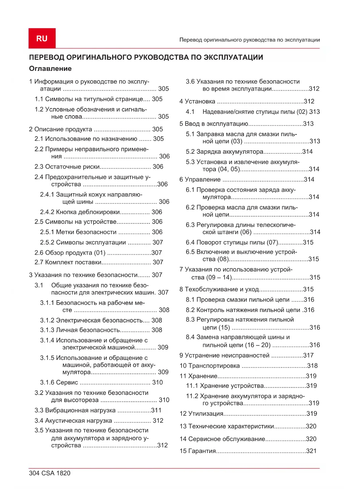 Высоторез предназначен для обрезки прямо с земли веток и сучьев на устойчивых деревьях и крупных кустарниках. При этом пользова- тель обязательно должен занять устойчивую позицию на земле. Для смазки пильной цепи разрешается ис- пользовать только биоразлагаемое масло. Любое другое использование, кроме указан- ных выше примеров использования по назна- чению, или иное использование считаются ис- пользованием не по назначению. Это устройство предназначено для частного использования. Любое другое использование, а также несанкционированные модификации или дополнения рассматриваются как ненад- лежащее использование и приводят к призна- нию недействительной гарантии, а также к по- тере соответствия и отказу от любой ответ-RU 306 CSA 1820 Описание продукта ственности за ущерб пользователю или тре- тьим лицам со стороны производителя.