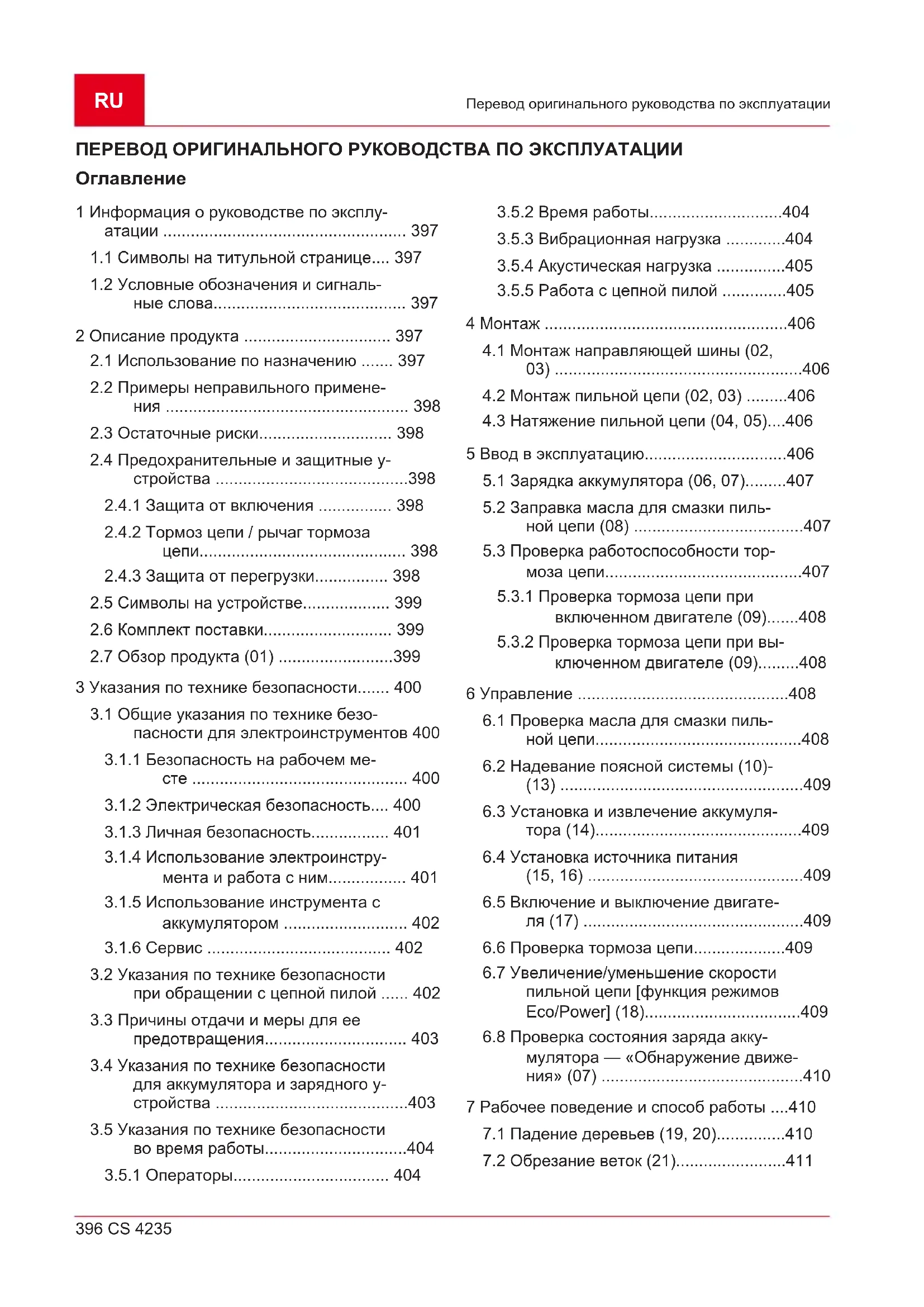 Цепная пила рассчитана исключительно на применение в домашнем и приусадебном хо- зяйстве. В этой области цепная пила подхо-RU 398 CS 4235 Описание продукта дит для распиловки легкой древесины, напри-