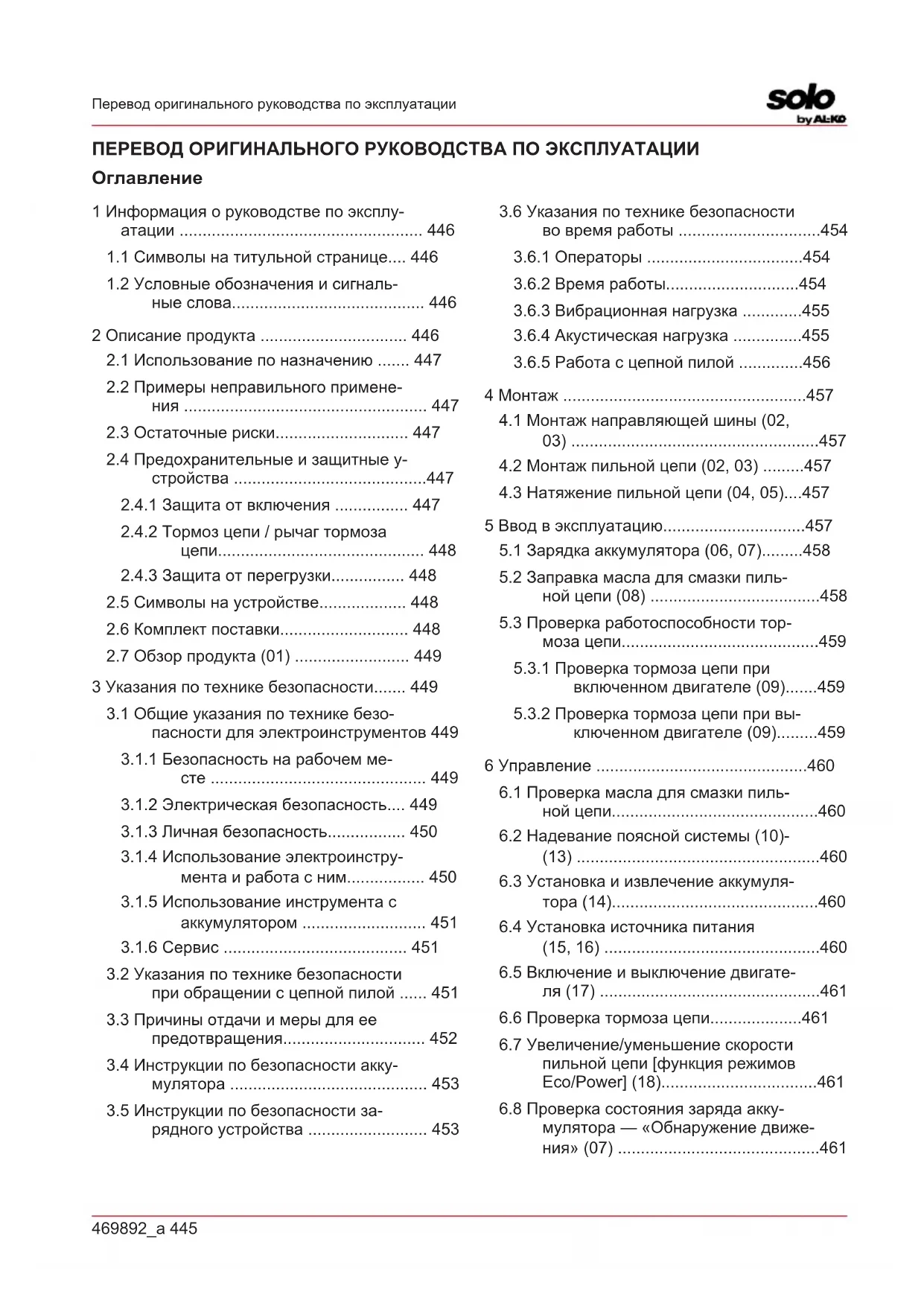 Скачайте инструкцию для вашего Пила в формате PDF бесплатно! Найдите своё руководство Solo CS 4235 - AL-KO и возьмите своё электронное устройство обратно в руки. На этой странице опубликованы все документы, необходимые для использования вашего устройства. Solo CS 4235 бренда AL-KO.