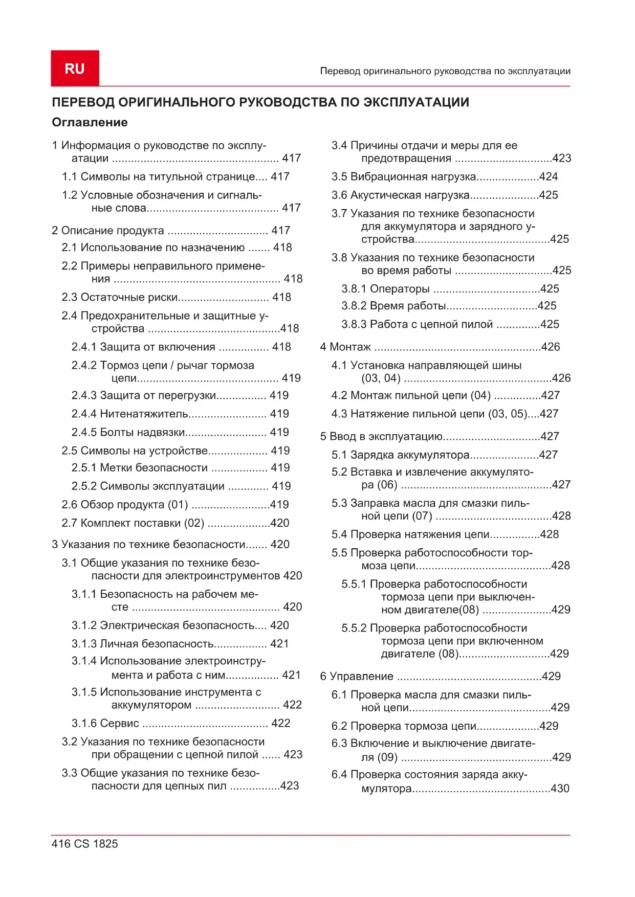 ОПАСНОСТЬ! Указывает на опасную си- туацию, которая, если ее не избежать, приво- дит к смерти или серьезным травмам. ПРЕДУПРЕЖДЕНИЕ! Указывает на по- тенциально опасную ситуацию, которая, если ее не избежать, может привести к смерти или серьезным травмам. ОСТОРОЖНО! Указывает на потенциаль- но опасную ситуацию, которая, если ее не из- бежать, может привести травмам легкой и средней тяжести. ВНИМАНИЕ! Указывает на ситуацию, кото- рая, если ее не избежать, может привести к и- мущественному ущербу. ПРИМЕЧАНИЕ Специальные указания для облегчения понимания и эксплуатации. 2 ОПИСАНИЕ ПРОДУКТА В этом руководстве по эксплуатации описана ручная цепная электропила, которая получает питание от аккумулятора. Устройство разрешается использовать только вместе с литий-ионными аккумуляторами и за- рядными устройствами, указанными в техни- ческих характеристиках. Дополнительные све-RU 418 CS 1825 Описание продукта дения об аккумуляторах и зарядных устрой- ствах см. в отдельных инструкциях: