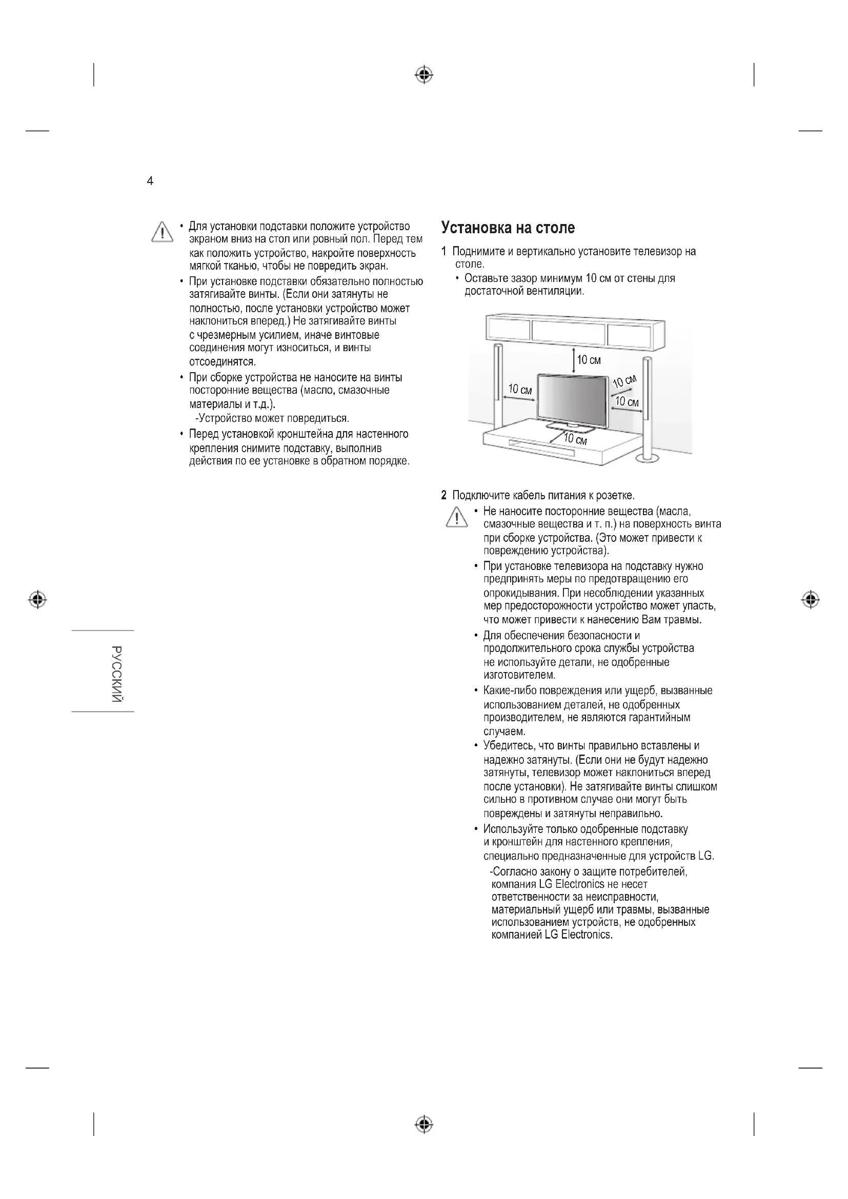 - Используйте только одобренные подставку и кронштейн для настенного крепления, специально предназначенные для устройств LG. - Согласно закону о защите потребителей, компания LG Electronics не несет ответственности за неисправности, материальный ущерб или травмы, вызванные использованием устройств, не одобренных компанией LG Electronics.5