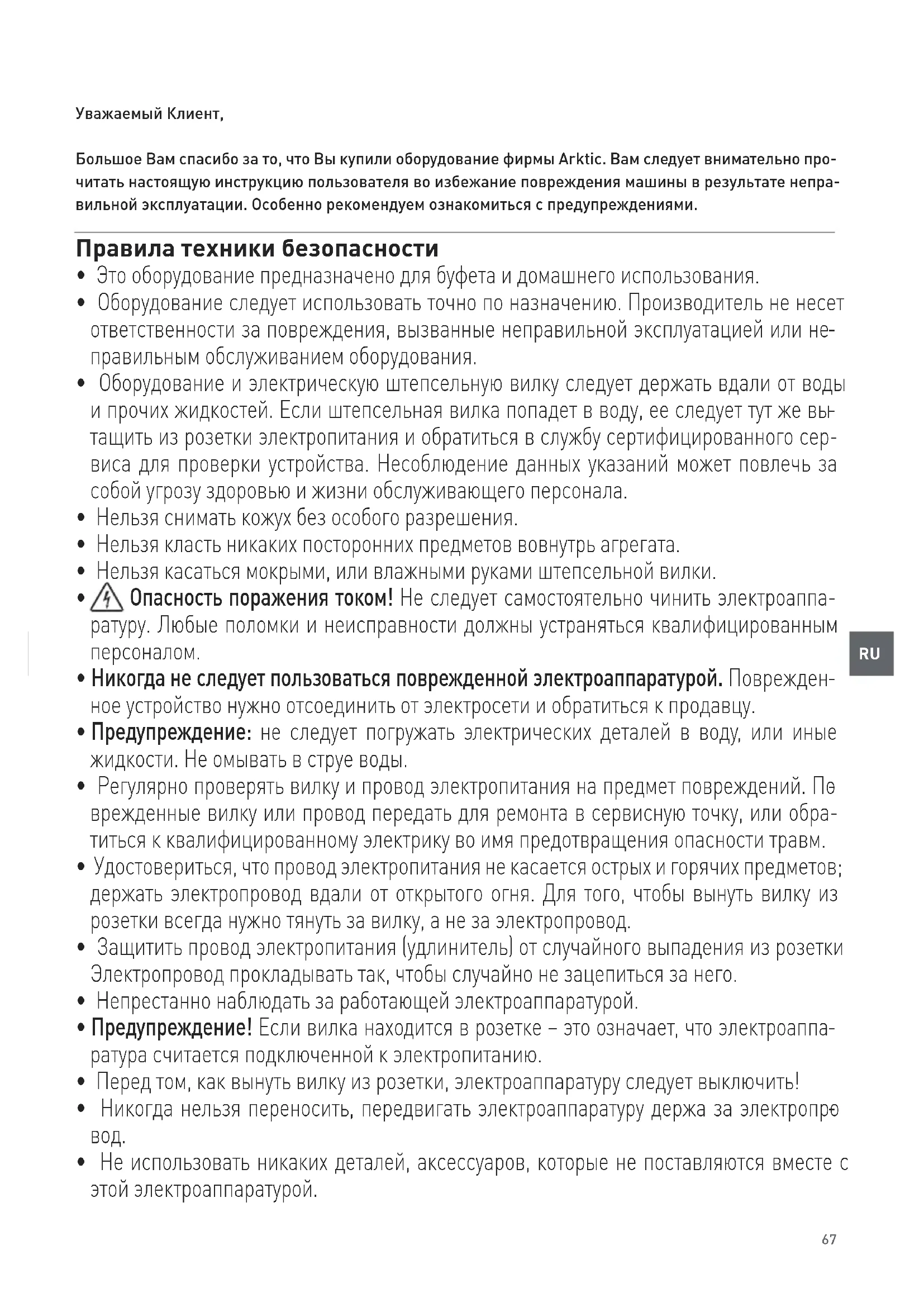 Уважаемый Клиент, Большое Вам спасибо за то, что Вы купили оборудование фирмы Arktic. Вам следует внимательно про- читать настоящую инструкцию пользователя во избежание повреждения машины в результате непра- вильной эксплуатации. Особенно рекомендуем ознакомиться с предупреждениями. Правила техники безопасности