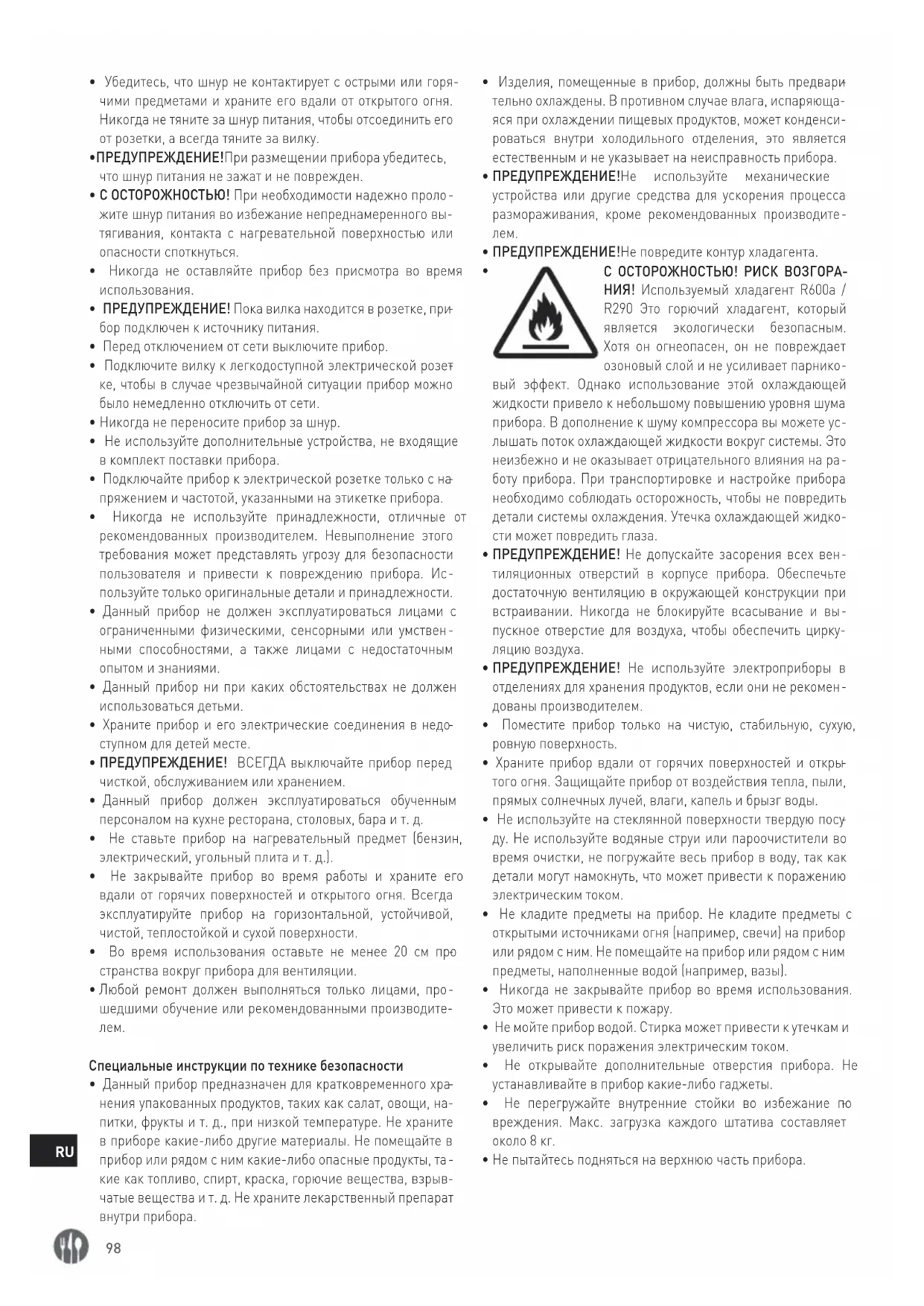 С ОСТОРОЖНОСТЬЮ! РИСК ВОЗГОРА- НИЯ! Используемый хладагент R600a / R290 Это горючий хладагент, который является экологически безопасным. Хотя он огнеопасен, он не повреждает озоновый слой и не усиливает парнико